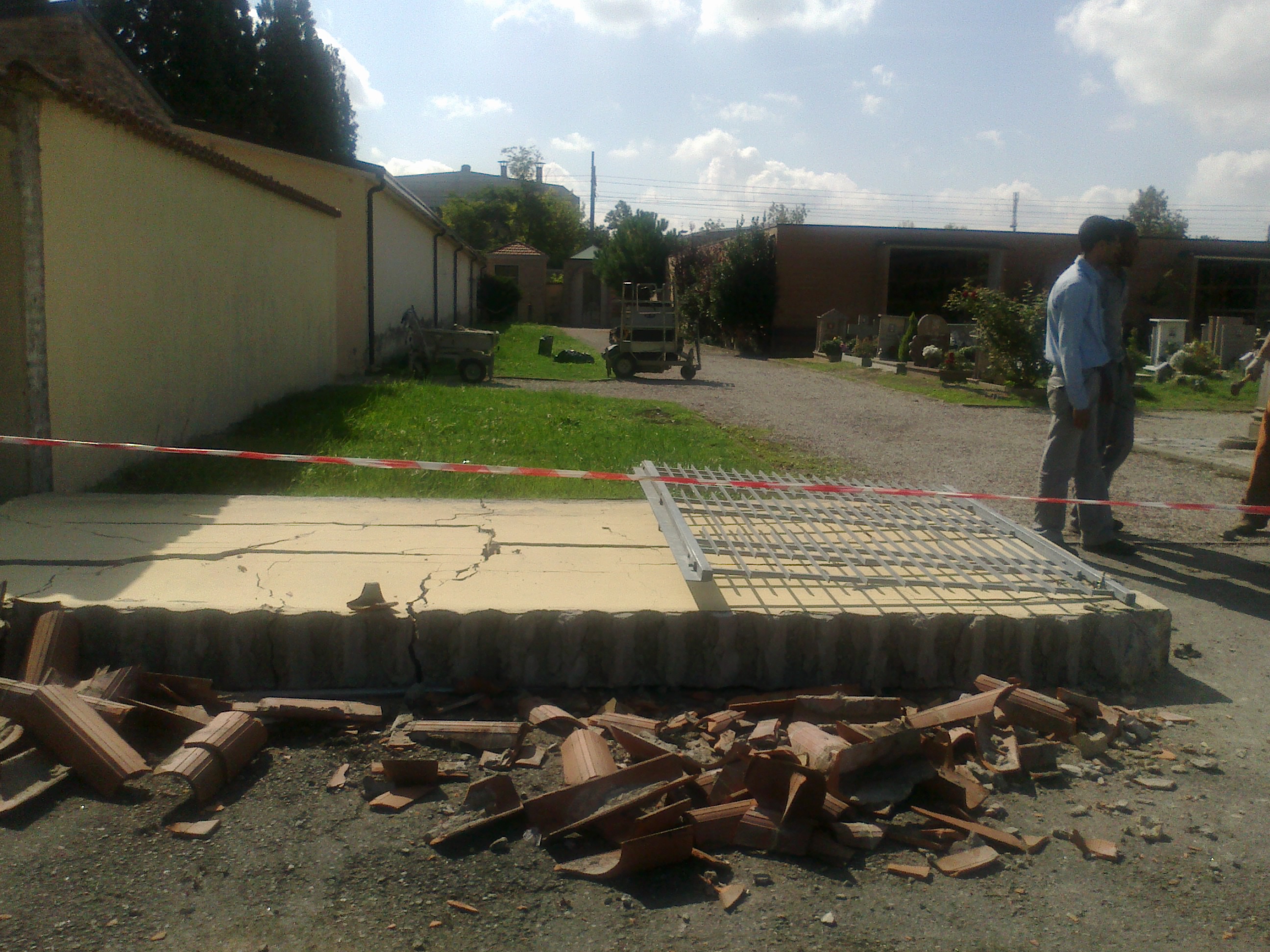 Una porzione di alcuni metri del muro di cinta del cimitero di Saliceto Panaro, già danneggiata dal terremoto e da allora transennata in attesa di realizzare gli interventi necessari al ripristino, è crollata nella mattinata di martedì 2 ottobre. Sul posto sono intervenuti gli operatori di Polizia mortuaria e i tecnici del servizio Lavori pubblici del Comune per mettere in sicurezza la zona. Mercoledì 3 ottobre sarà completata la rimozione dei detriti.
