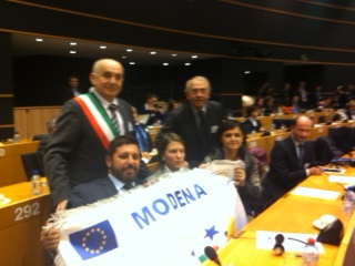 La bandiera che ufficializza la nomina di Modena come “Città europea 2013 dello sport” è stata consegnata oggi, mercoledì 7 novembre, nella sede del Parlamento europeo al sindaco Giorgio Pighi e alla delegazione modenese composta anche dall’assessore allo Sport Antonino Marino e dalla campionessa delle Paralimpiadi Cecilia Capellini.