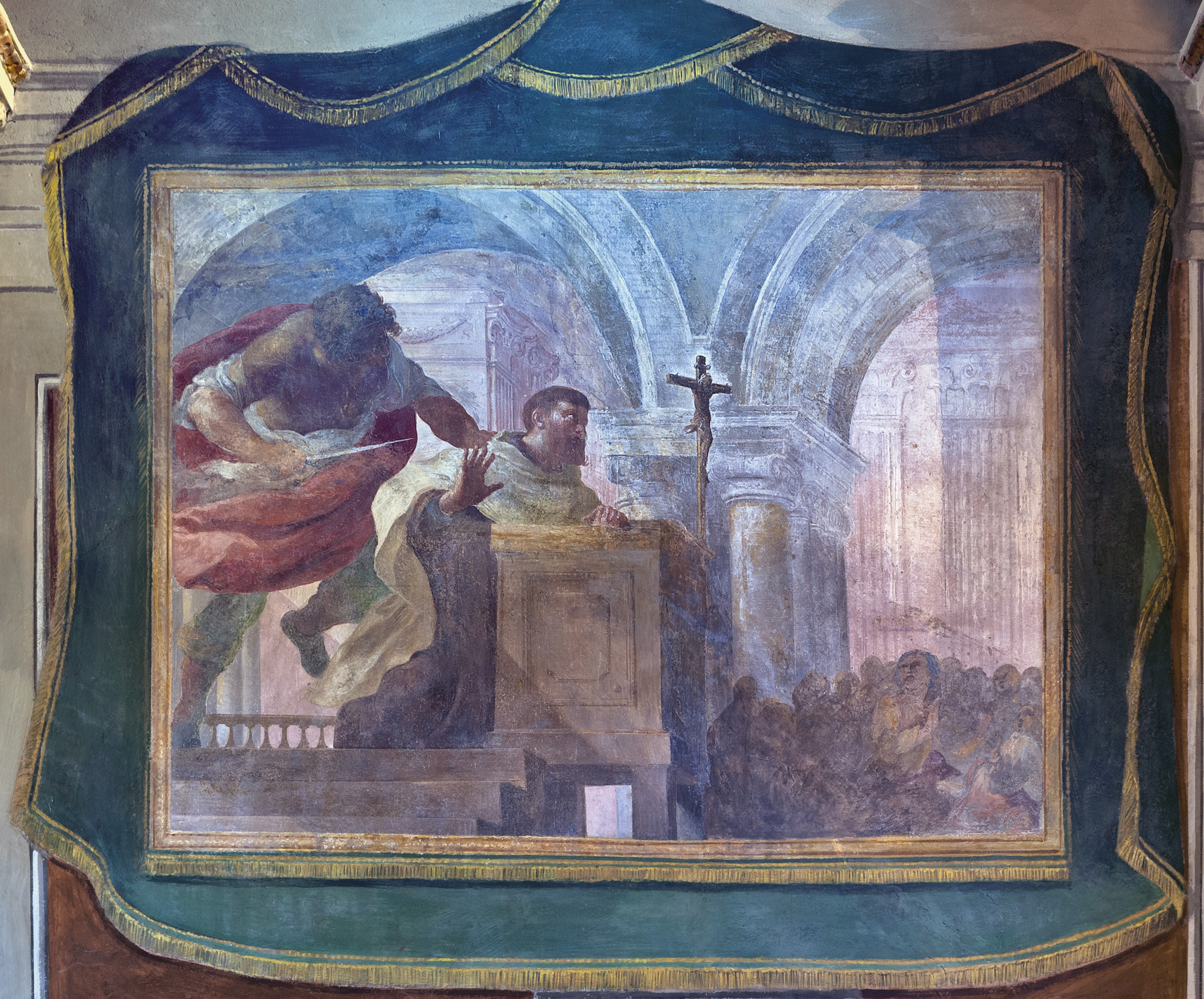 Il restauro ha interessato la Cappella di Sant'Angelo di Sicilia, il santo carmelitano omonimo del committente e priore dell'ordine, Angelo Monesi, che intorno al 1632 fece erigere la sagrestia affidandone la decorazione ai bolognesi Angelo Michele Colonna e Agostino Mitelli, forse in collaborazione con il loro maestro Girolamo Curti detto il Dentone. Il soffitto e le pareti decorate della Cappella versavano in condizioni conservative precarie, tali da rendere la decorazione poco leggibile.