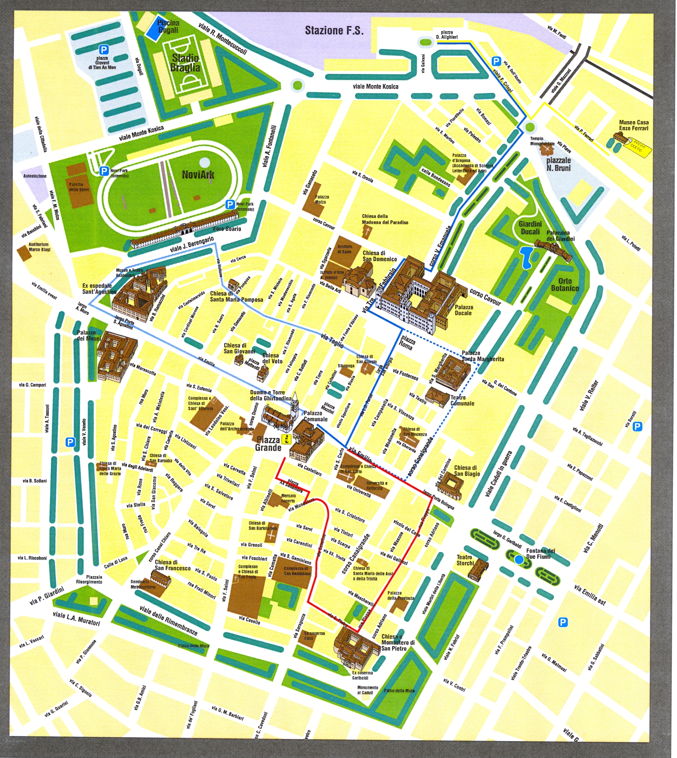 I segnali collocati in questi giorni illustrano in italiano e in inglese alcuni tra i più importanti monumenti e luoghi cittadini: Duomo, Ghirlandina, piazza Grande, Palazzo comunale, Palazzo dei Musei, chiesa di Sant'Agostino, chiesa di San Giovanni, Palazzo ducale.