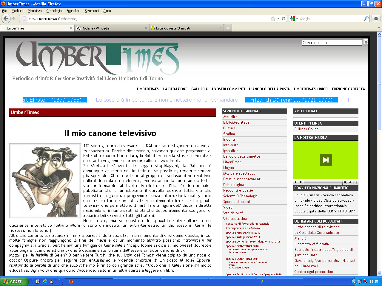 Quindici minuti di videogiornale, con tanto di speaker, inviati e interviste ai protagonisti, per raccontare la crisi della Fiat a Termini Imerese. Quarantotto pagine illustrate, con uno speciale sulle gite, sondaggi, recensioni di spettacoli, risultati delle squadre di calcio e pallavolo scolastiche. Un sito web con aggiornamenti quasi quotidiani e un titolo, “Umbertimes”, che strizza l'occhio ai più importanti giornali del mondo anglosassone. Sono questi i tre vincitori del concorso nazionale di giornalismo scolastico promosso dal Comune di Modena insieme all'associazione Progettarte e alla redazione degli studenti modenesi “Voci dal branco”. Scelti tra 61 partecipanti da tutta Italia, sono stati premiati sabato 3 marzo nella chiesa di San Carlo nell'ambito della fiera della piccola e media editoria “Buk”.