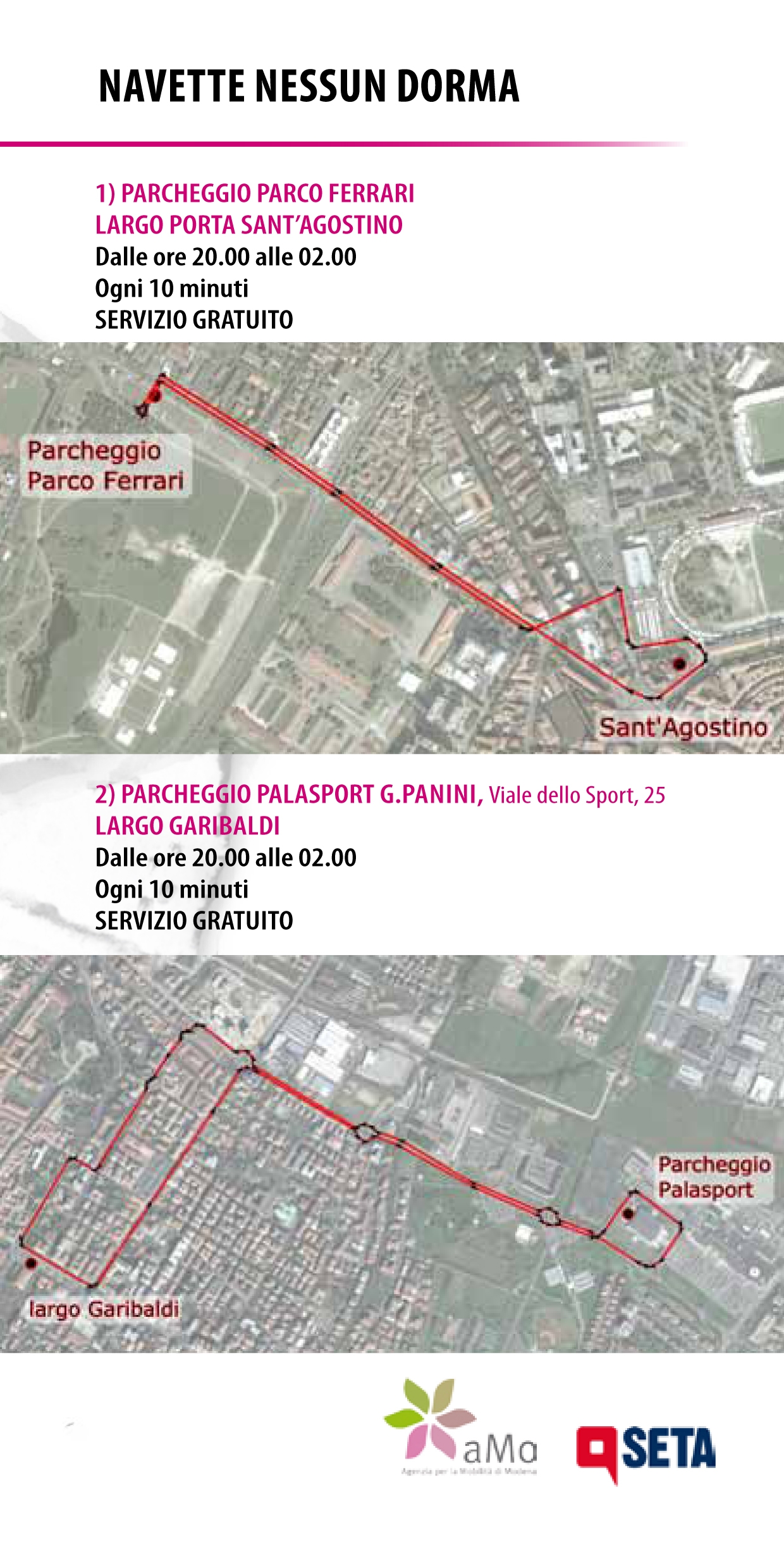 Il servizio di navetta incomincia alle 20 e termina alle 2 per consentire ai modenesi di seguire anche il concerto dei P-funking band davanti a Palazzo dei Musei, in programma da mezzanotte o per rimanere in centro fino all’ultimo.