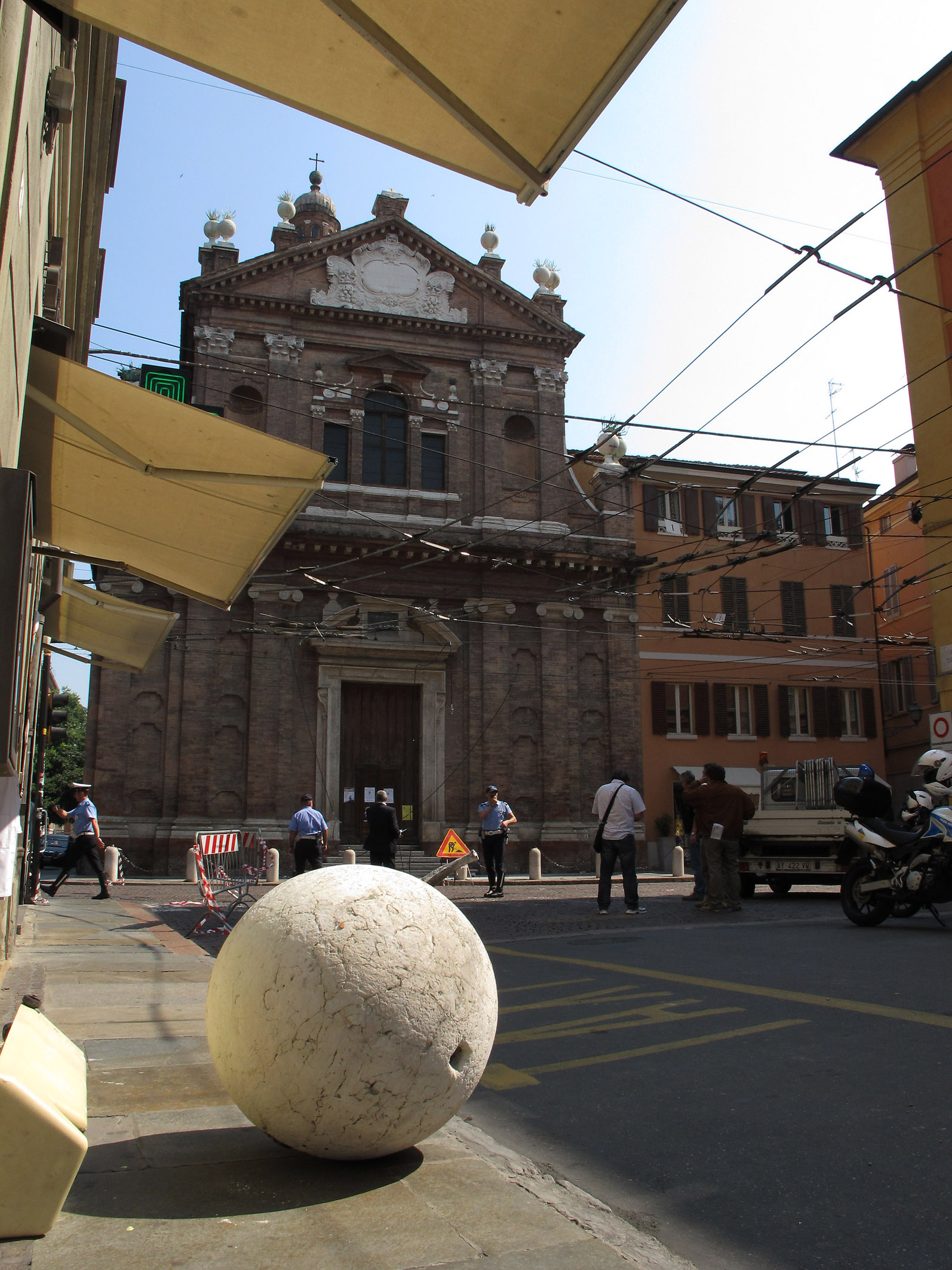In centro storico è stata transennata via Emilia Centro all’altezza di piazza Matteotti per la caduta di una palla di cemento dalla sommità della facciata della Chiesa del Voto.