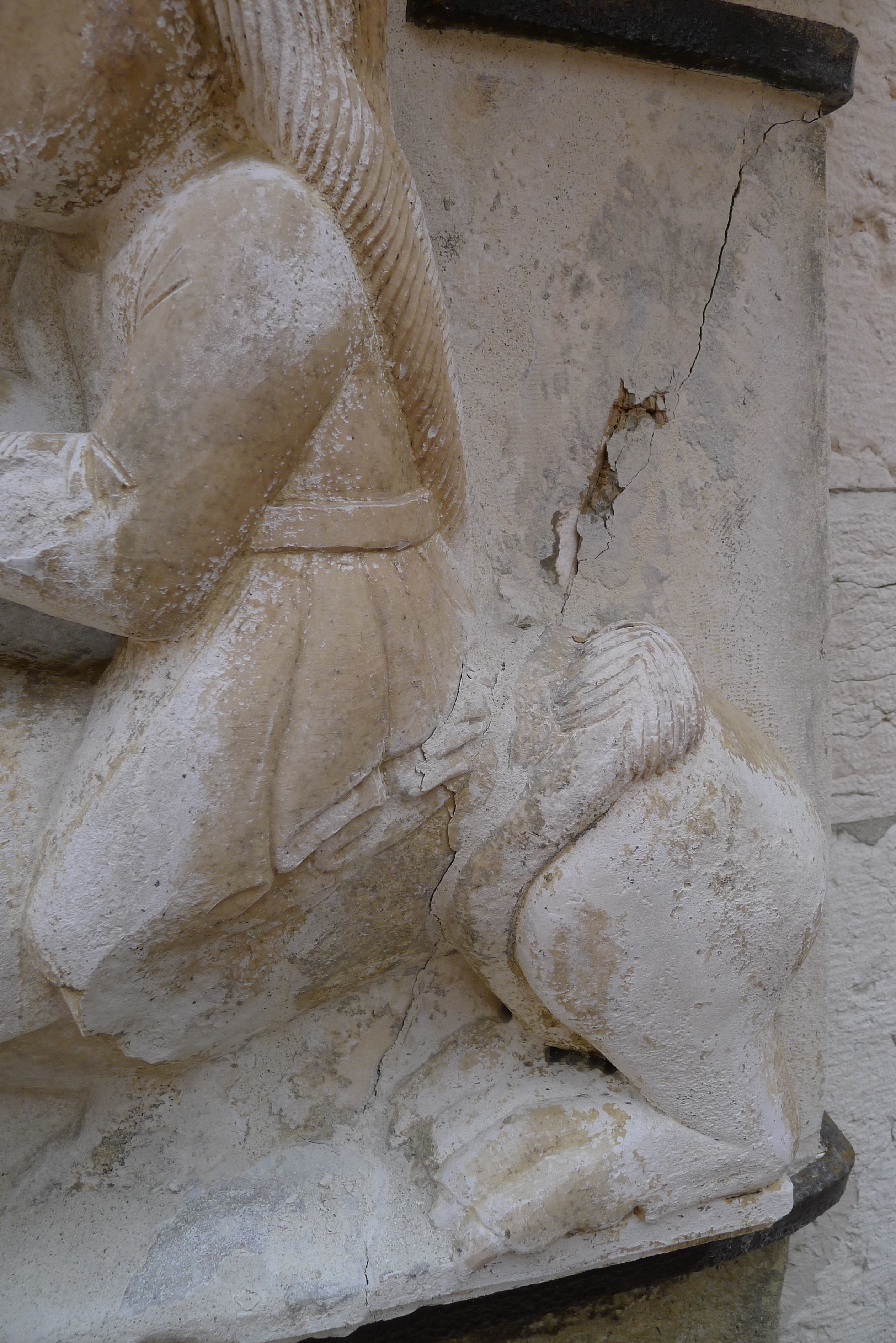 La scultura si è spezzata in diagonale facendo cadere frammenti dalla parte piana del blocco sulla quale è scolpita, ma si presenta integra nella parte plastica in rilievo.