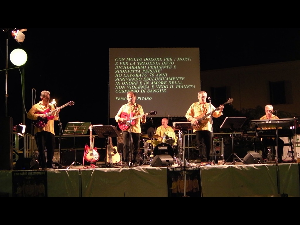 I “Radio Luxembourg” – Sandro Gibellini, voce e chitarra, Gigi Bertolini, batteria, Maurizio Dondi, chitarra e voce, Maurizio Botti, tastiere e voce e Giorgio Masi, basso e voce – si esibiscono sul palco dei Giardini per circa due ore, rigorosamente in divisa orchestrale come era d’obbligo per i complessi dell’epoca (in diversi dei quali hanno suonato anche i componenti del gruppo).