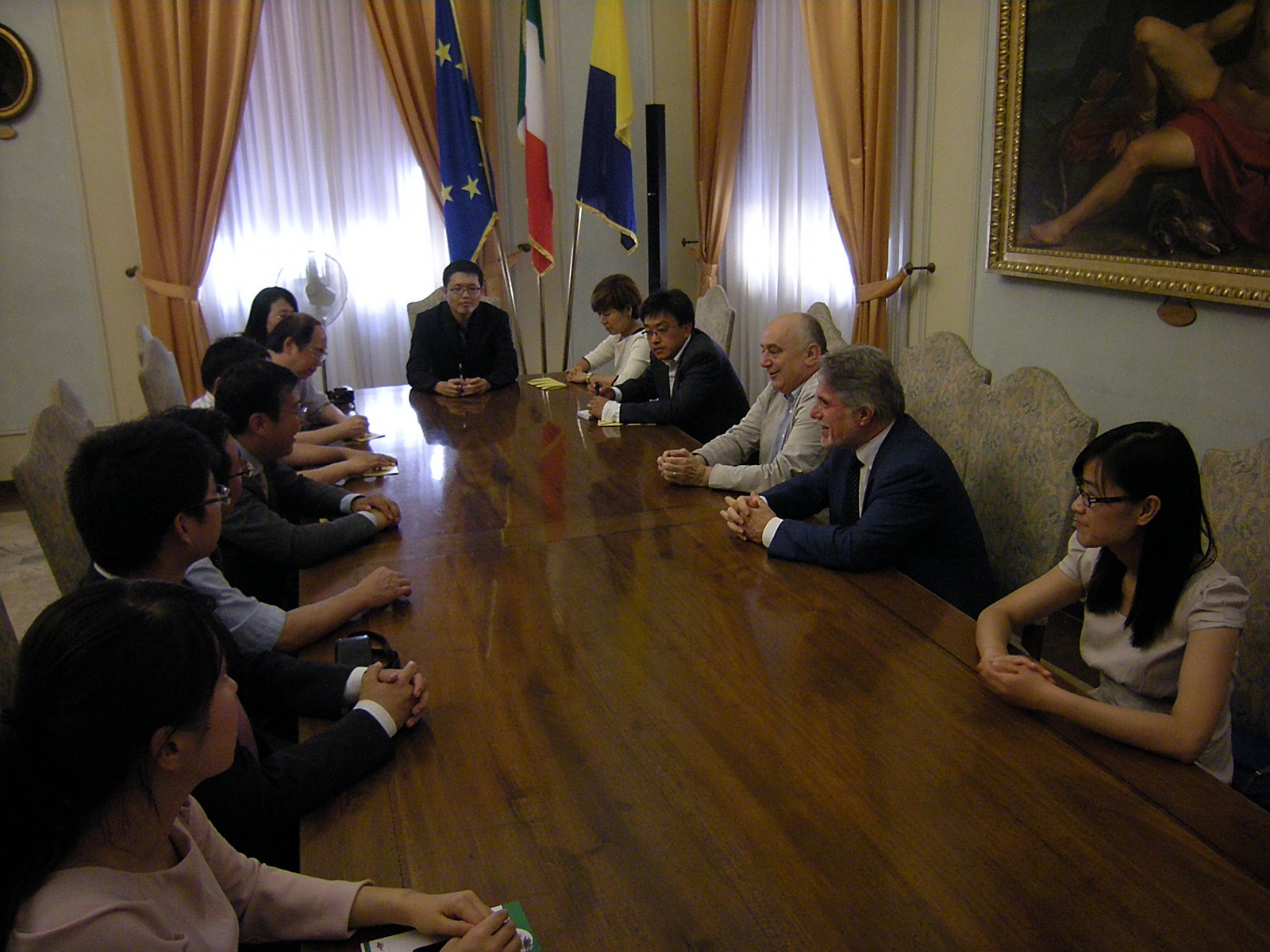 Sono stati ricevuti in Municipio nel pomeriggio di oggi, venerdì 13 luglio, 13 imprenditori cinesi, tra i quali 6 donne, all'interno di una delegazione che comprendeva anche il console cinese Bin Li, responsabile dell'area del Nord Italia (Piemonte, Lombardia, Veneto, Emilia-Romagna), il consigliere per l'internazionalizzazione della Camera di commercio cinese in Italia (Ccpit) Zhang Gang, rappresentanti della Bank of China in Italia e Giancarlo Zanni, già dirigente della Camera di commercio di Modena e direttore di Promec. La delegazione cinese ha incontrato il sindaco Giorgio Pighi e l'assessore all'Economia Daniele Sitta.