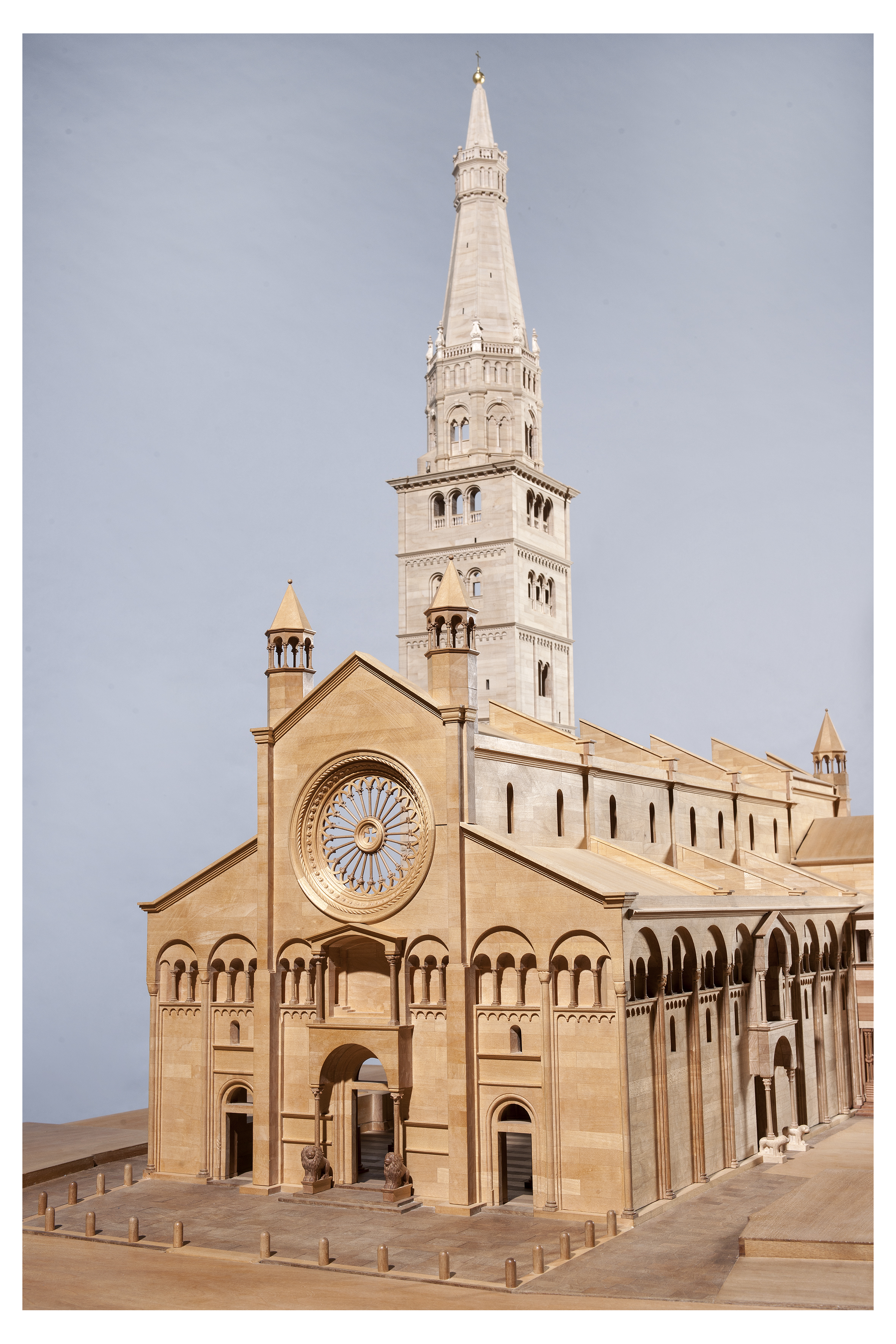 Il plastico evidenzia l’unitarietà del complesso monumentale “Duomo, Torre Ghirlandina e Piazza Grande”, entrato a far parte della Lista del Patrimonio Mondiale dell’Umanità nel 1997. Accanto al modello è collocato un video che si apre con una selezione degli oltre 5.000 scatti fotografici realizzati da Cesare Leonardi tra il 1983 e il 1984 percorrendo “palmo dopo palmo” il Duomo di Modena e prosegue illustrando le principali fasi di realizzazione dei due modelli. Cesare Leonardi (Modena, 1935) è architetto, fotografo, designer, pittore e scultore, noto sia in Italia che all'estero. Adriano Peroni, storico dell’arte e dell’architettura medievali, nei primi anni Ottanta fece parte del Comitato Scientifico della mostra Lanfranco e Wiligelmo: il Duomo di Modena” (1984), coordinando la sezione sull’architettura e scrivendo un importante saggio. Nel 1988 ha curato la pubblicazione del volume “Il Duomo di Modena. Atlante grafico”, che raccoglie i rilievi realizzati da Giancarlo Palazzi e nel 2006 – con Francesca Piccinini – la mostra e il catalogo “Romanica. Arte e liturgia nelle terre di San Geminiano e Matilde di Canossa”.