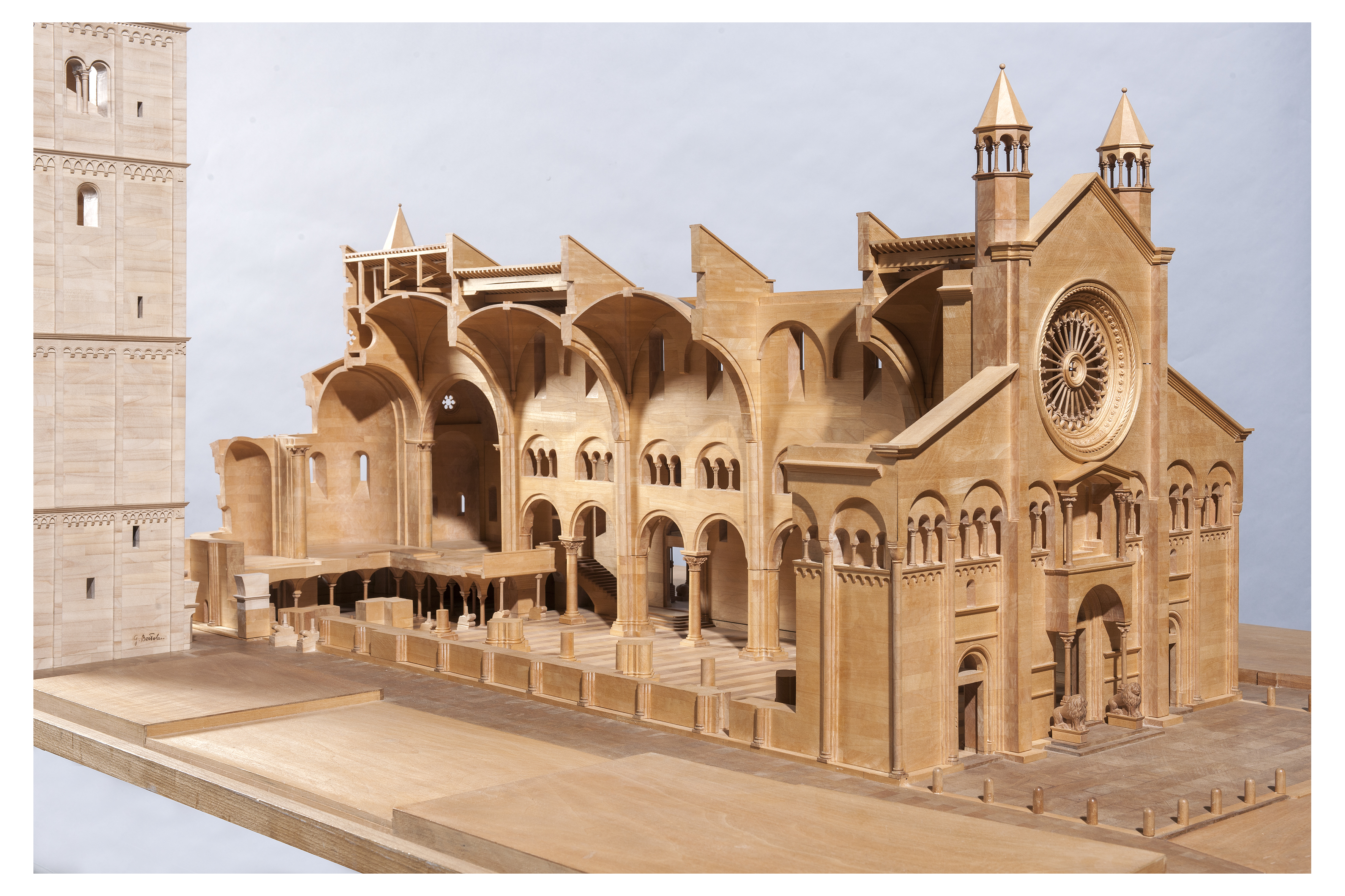 Il modello ligneo consente di ammirare le complesse caratteristiche costruttive dei due monumenti e di cogliere molti particolari architettonici difficilmente apprezzabili attraverso la visita diretta. L’opera è stata realizzata in diverse parti scomponibili e ricomponibili ad incastro per permettere una maggiore fedeltà esecutiva ed un’accessibilità visiva tale da consentire una più accurata lettura delle particolarità architettoniche dei due edifici. Diverse le essenze utilizzate: acero, pero e noce per la cattedrale; acero e tiglio per la torre.