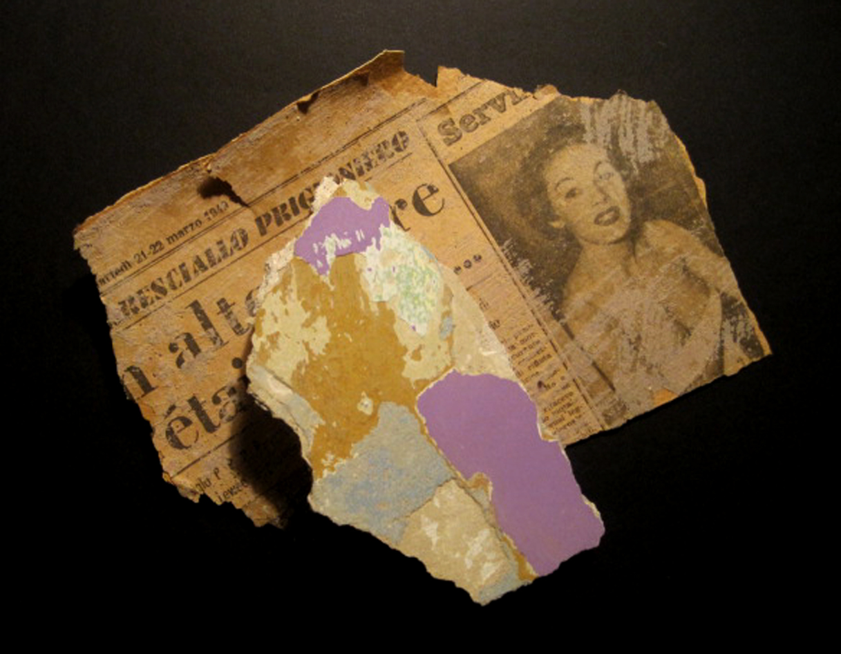 E, ancora, Lorenzo ha consegnato un pezzo di intonaco: "E' un pezzetto d'intonaco della mia casa caduto durante il terremoto del 29 maggio, probabilmente fatto con calce magra a fine '500 - inizio '600. Attraverso la stratificazione dei colori, su questo pezzo si legge la vita delle famiglie che sono passate in questa casa. I nostri due sono il violetto della stanza di mia figlia, che copre il verde della destinazione precedente. Sotto c'era una carta da parati applicata nel 1949, come testimonia il frammento di giornale che ne faceva da base. Era della famiglia che ci ha preceduto".