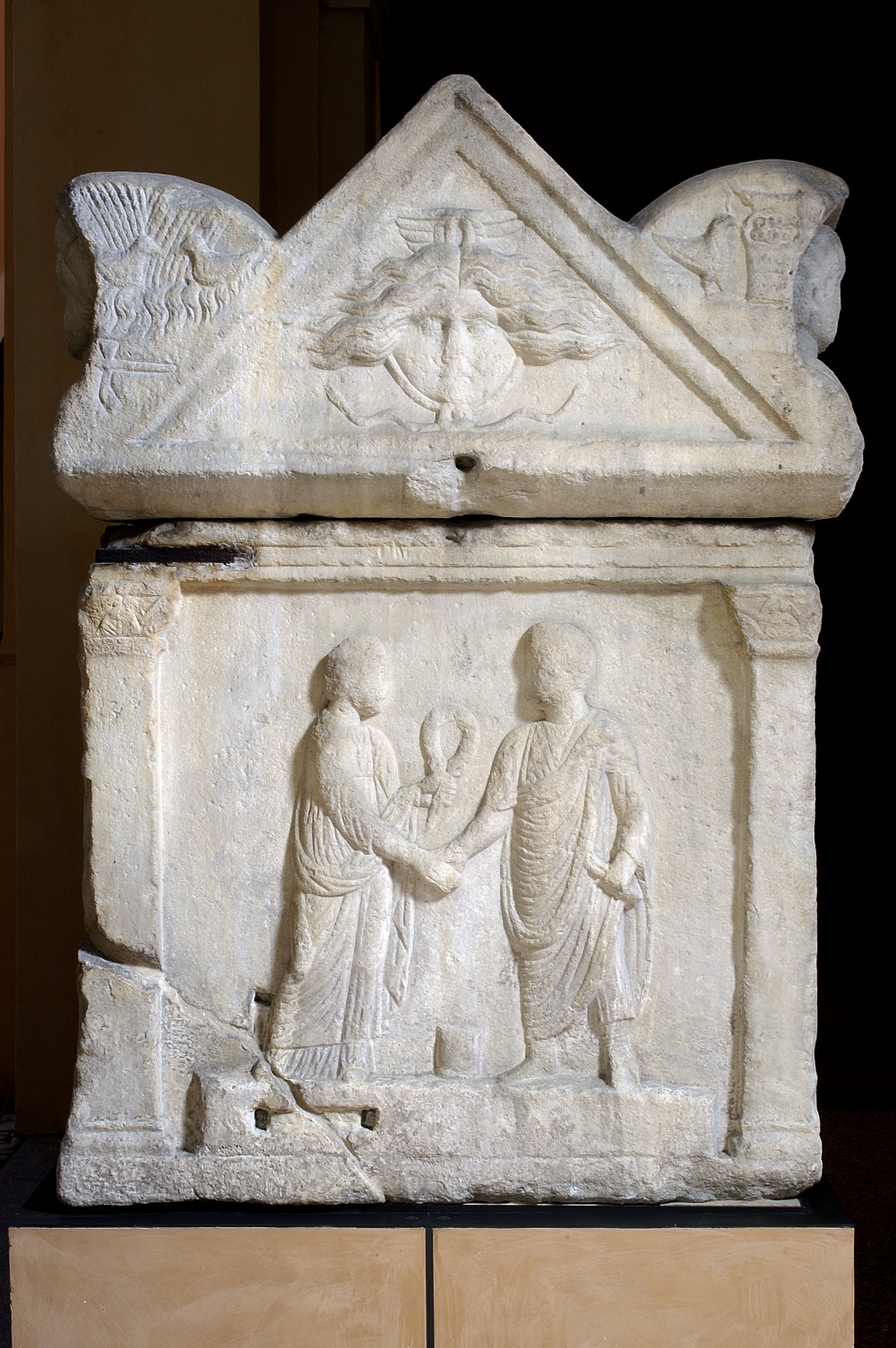 Un uomo ed una donna che si stringono la mano destra rappresentano il rituale solenne del matrimonio nella sua formulazione ufficiale e giuridica, consentito anche ad alcune categorie sacerdotali. Altri ritratti, immagini simboliche e testi iscritti sui monumenti rimandano alle diverse declinazioni dell’amore dall’inizio dell’età imperiale romana fino all’ufficializzazione della religione cristiana nel IV secolo d.C. Emergono storie di matrone, spose-bambine, concubine, liberte legate a personaggi dell’alta burocrazia imperiale o degli elevati ranghi militari.