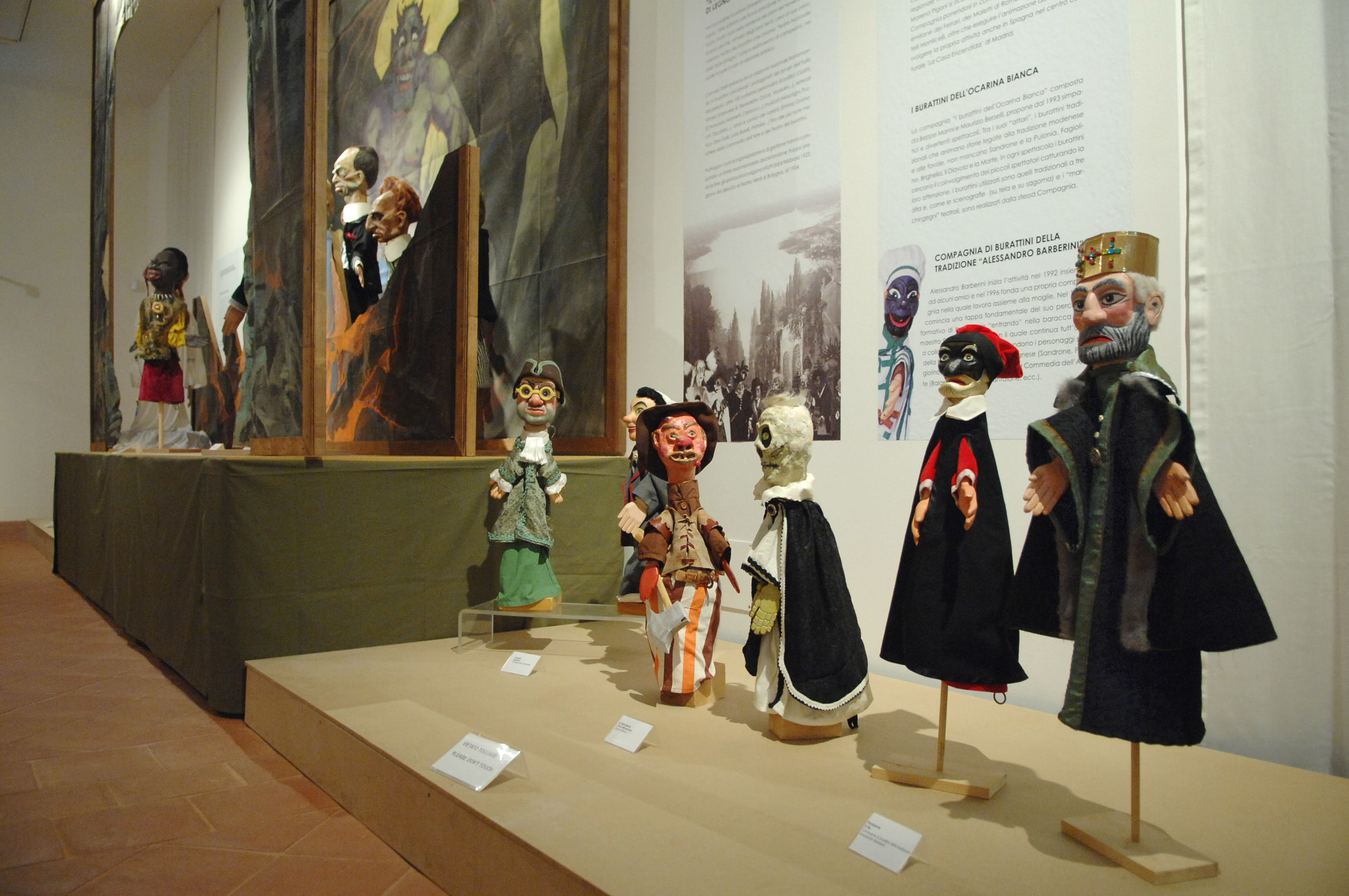 Attraverso un percorso cronologico che per la prima volta riunisce materiali appartenenti a collezioni pubbliche e private, la mostra a cura di Stefano Bulgarelli e Luana Ponzoni, presenta le maggiori personalità modenesi del teatro dei burattini concludendo la rassegna con un'apertura sulle attuali compagnie riunite nel “Consorzio dei burattinai modenesi”. In mostra ci sono anche alcuni dei materiali donati da Mauro Zanichelli al Museo civico d'arte: quinte e scenografie appartenenti al “Teatro Nazionale delle Teste di legno” di Umberto Tirelli, i cui burattini erano ritratti caricaturali dei protagonisti del jet-set dell'Italia degli anni Venti.