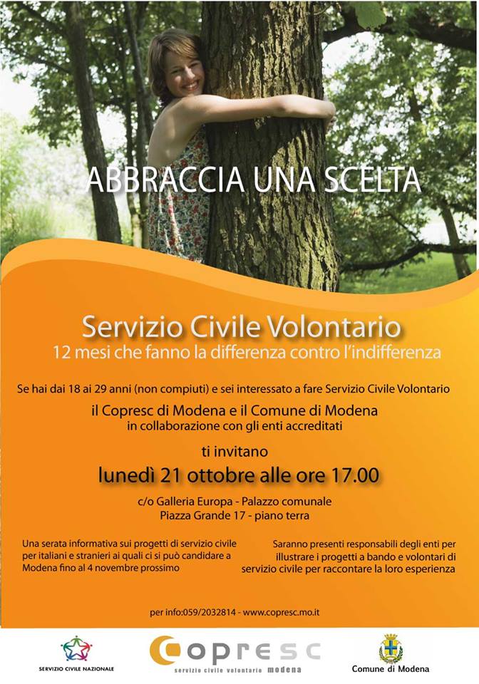 Lunedì 21 ottobre alle ore 17 alla Galleria Europa di piazza Grande (piano terra del Municipio) il Copresc Modena presenta il Servizio Civile e ciascuno degli Enti accreditati in città illustra il proprio progetto grazie anche alle testimonianze di ex volontari.