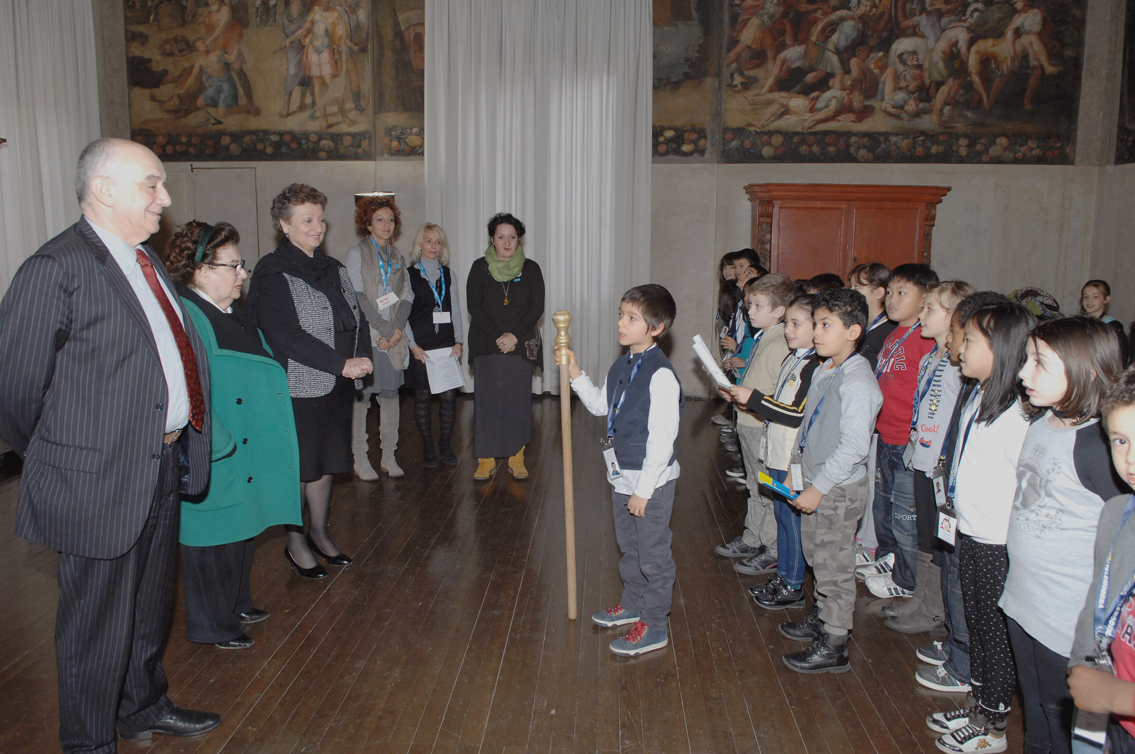 Un singolare banditore questa mattina, mercoledì 20 novembre, ricevuto nella sala del Fuoco del Municipio, ha portato al sindaco Giorgio Pighi un dispaccio molto speciale: il Rapporto Unicef 2013 dedicato alla condizione dell’infanzia nel mondo. Il banditore era uno dei 25 alunni della classe terza A della scuola primaria Leopardi ricevuta, assieme alle insegnanti, dal sindaco e dall’assessore all’Istruzione Adriana Querzè. Erano presenti la presidente della sezione modenese Unicef Adonella Ferraresi e alcune delegate della organizzazione non governativa internazionale impegnata nella difesa dei diritti dei bambini.