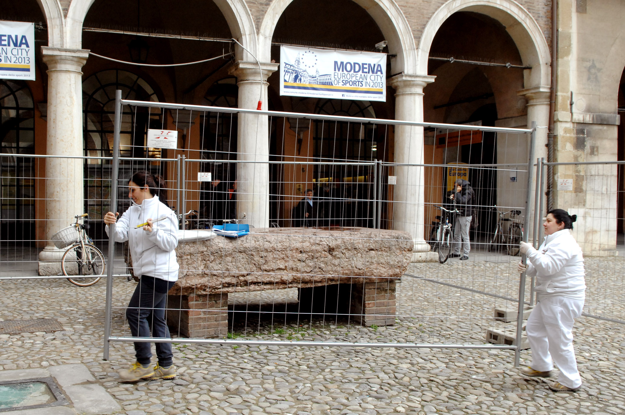 Oggi, martedì 26 marzo, è stata allestita la zona cantiere intorno alla “Pedra ringadora” in piazza Grande. Subito dopo Pasqua inizieranno i lavori di restauro dello storico blocco di pietra di ammonitico veronese. L’intervento, che prevede una spesa di circa 5 mila euro, è finanziato dal Lions Club Modena Estense. Sino al 24 aprile tecnici di Artemusa Roma e tecnici comunali, coordinati dall’architetto Rosella Cadignani, saranno impegnati nel restauro conservativo di uno dei simboli di Modena. Con la supervisione della Soprintendenza ai beni artistici di Modena sono già stati analizzati i materiali usati in passato per i vari restauri, questo consentirà di intervenire per rimuoverli e passare poi alla pulizia e al restauro della pietra. All’accantieramento erano presenti stamane Gianfranco Sabatini e Mauro Martini del Lions Club Modena Estense, l’architetto del comune Rossella Cadignani e Silvia Tedoni restauratrice di Artemusa.