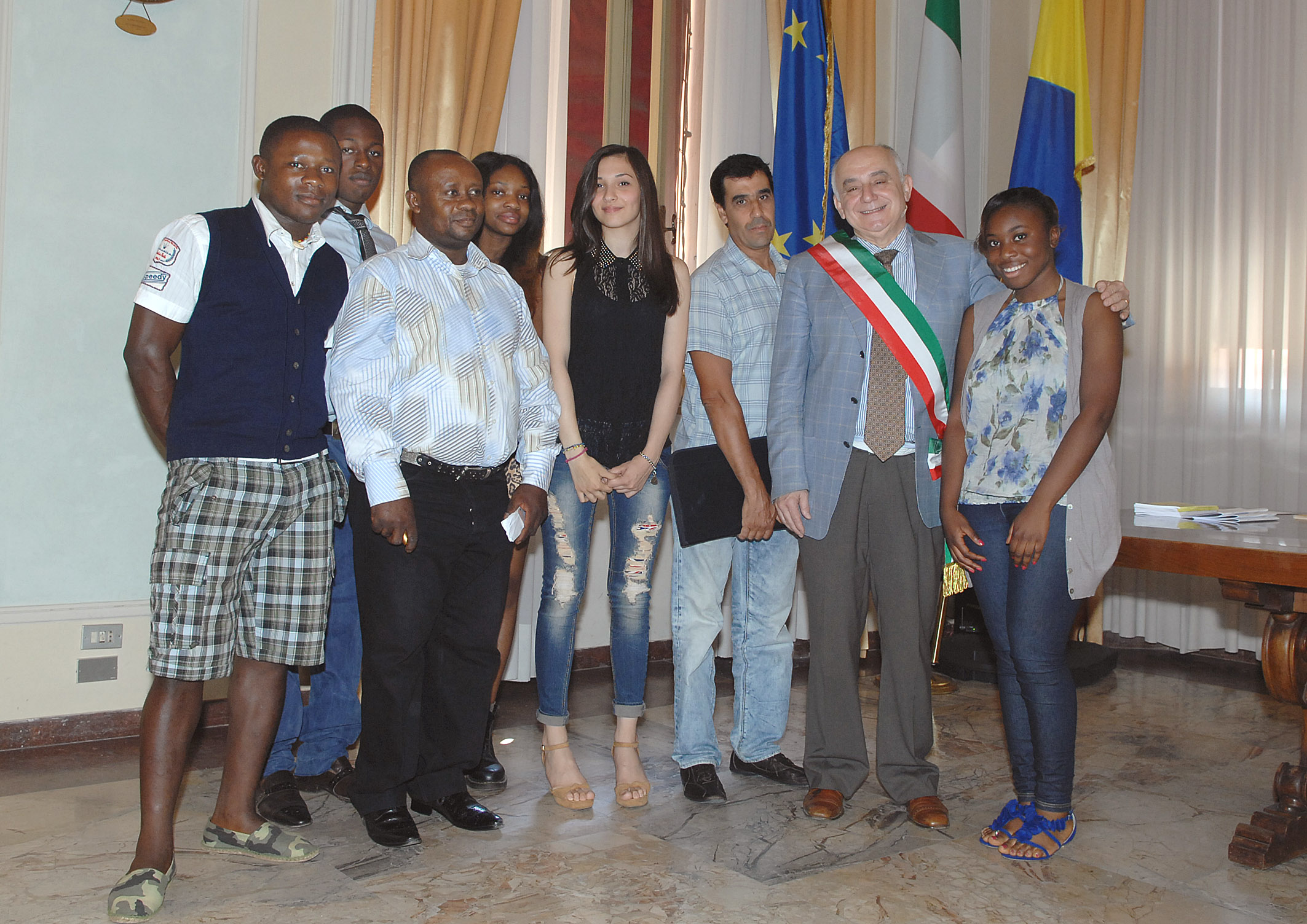 Sono in costante aumento i cittadini stranieri residenti nel nostro Comune che acquistano la cittadinanza italiana davanti al sindaco di Modena. Sono stati complessivamente 258 nel 2011, 421 l’anno successivo ed erano già 371 nei primi cinque mesi del 2013. Oggi, sabato 15 giugno, se ne sono aggiunti altri sei. La cerimonia di conferimento delle cittadinanze, che rappresenta un appuntamento consueto nella vita amministrativa modenese, si è svolta nella sala di Rappresentanza del Municipio. Meno consueto che tra i nuovi cittadini italiani ci fosse anche un giocatore diciassettenne della formazione Primavera del Modena Calcio, Frederick Ofosu Sekyere, che ha automaticamente acquistato la cittadinanza in seguito al giuramento del padre, ghanese da oltre dieci anni in Italia con permesso di soggiorno. Frederick potrà ora andare all’estero con la sua squadra, che è in procinto di partire per la Spagna.