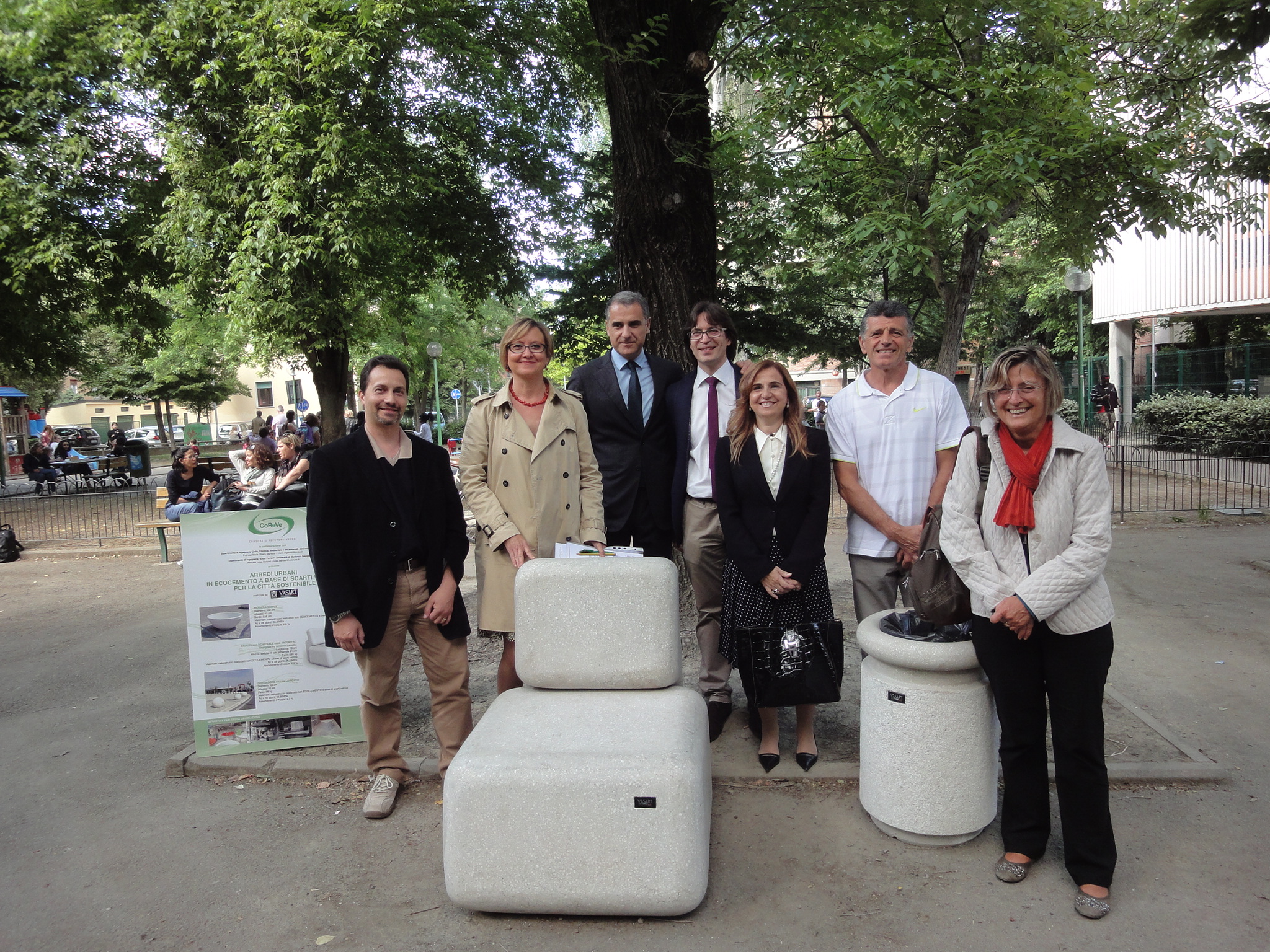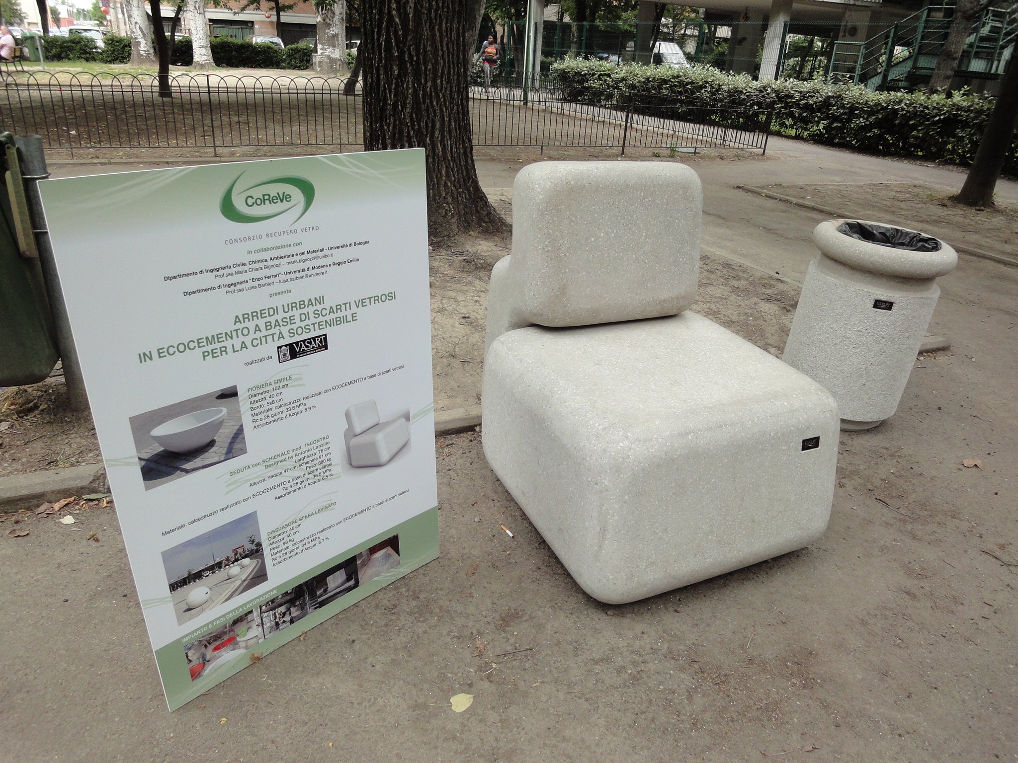 Da venerdì scorso nel parco San Giovanni Bosco, in Circoscrizione 2, è possibile sedere su una panchina e su un puf di design realizzati interamente in materiale riciclato. Assomigliano a una poltrona e un puf senza schienale e sono serviti da due cestini portarifiuti. Ad un primo sguardo il "salottino" sembra fatto di cemento, ma le sedute e i cestini sono oggetti ad alto contenuto innovativo prodotto con l'ecocemento a base di scarti vetrosi, frutto della ricerca scientifica di EcoTecnoMat, spin off dell'Università di Modena e Reggio Emilia. Alla cerimonia di inaugurazione erano presenti Simona Arletti, assessore all'Ambiente del Comune di Modena, Walter Stella, consigliere della Circoscrizione 2, Fernanda Andreola del Dipartimento di Ingegneria "Enzo Ferrari" dell'Università di Modena e Reggio Emilia, Massimiliano Avella del Consorzio Recupero Vetro (Co.Re.Ve.), Giovanna Franzelli e Claudio Luppi, dell'assessorato all'Ambiente, e Nicola di Tullio di Ancitel energia e ambiente. L'ecocemento, con cui sono costruiti la poltrona, il puf e i cestini, è il frutto della ricerca tutta italiana, innovazione di processo e di prodotto, per il recupero della frazione vetrosa di scarto che si ottiene dalla raccolta differenziata degli imballaggi e non riciclabile nel comparto del vetro cavo meccanico (produzione contenitori), sfociato nell'industrializzazione di un oggetto di design.