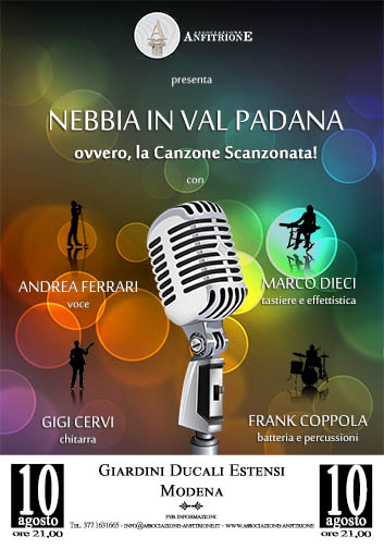 Che cos’è una “canzone scanzonata”? Per scoprirlo basterà essere ai Giardini Ducali di Modena sabato 10 agosto alle 21.30, per assistere gratuitamente allo spettacolo “Nebbia in Val Padana”, nell’ambito dell’Estate Modenese, a cura dell’associazione Anfitrione.