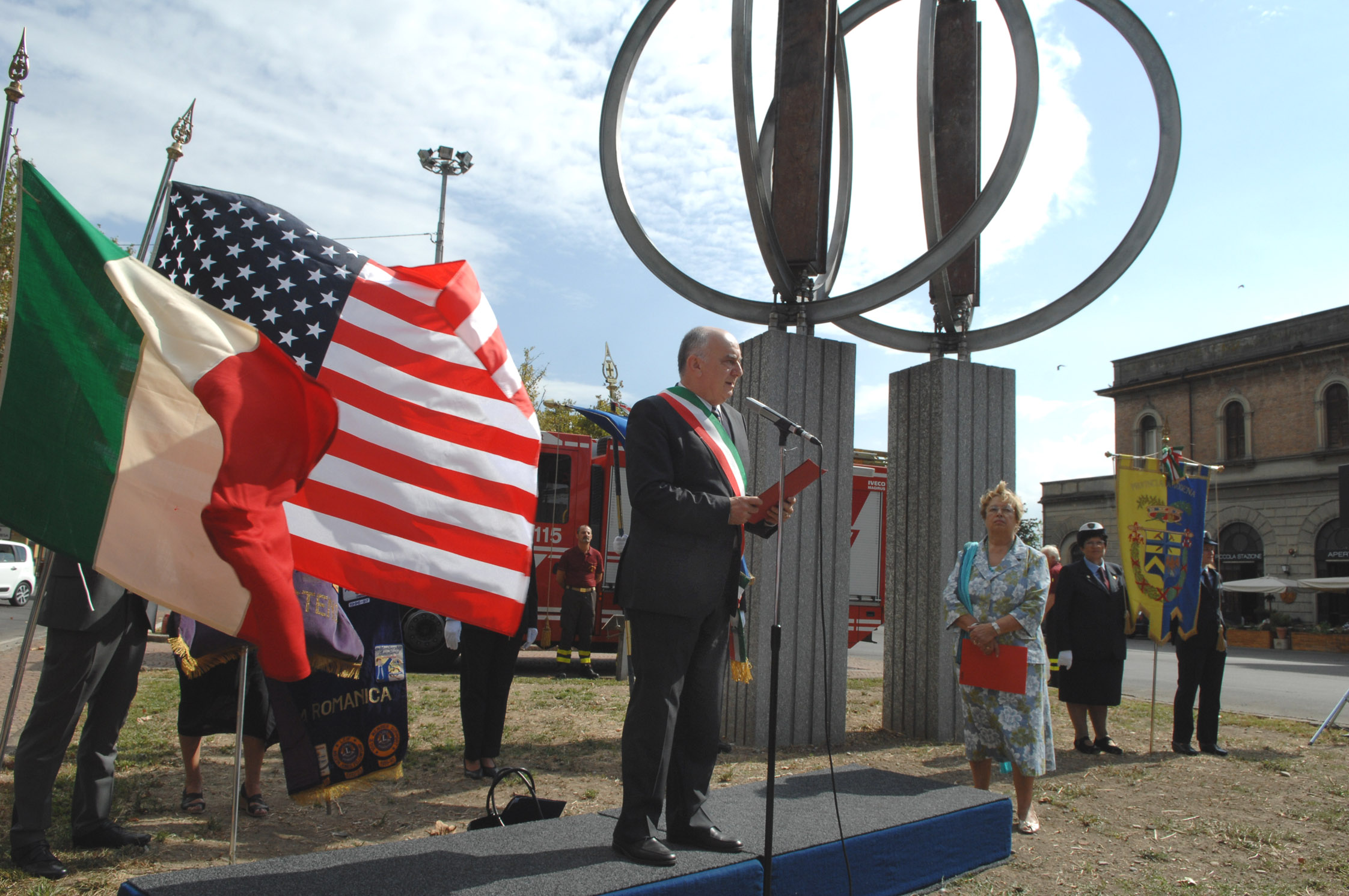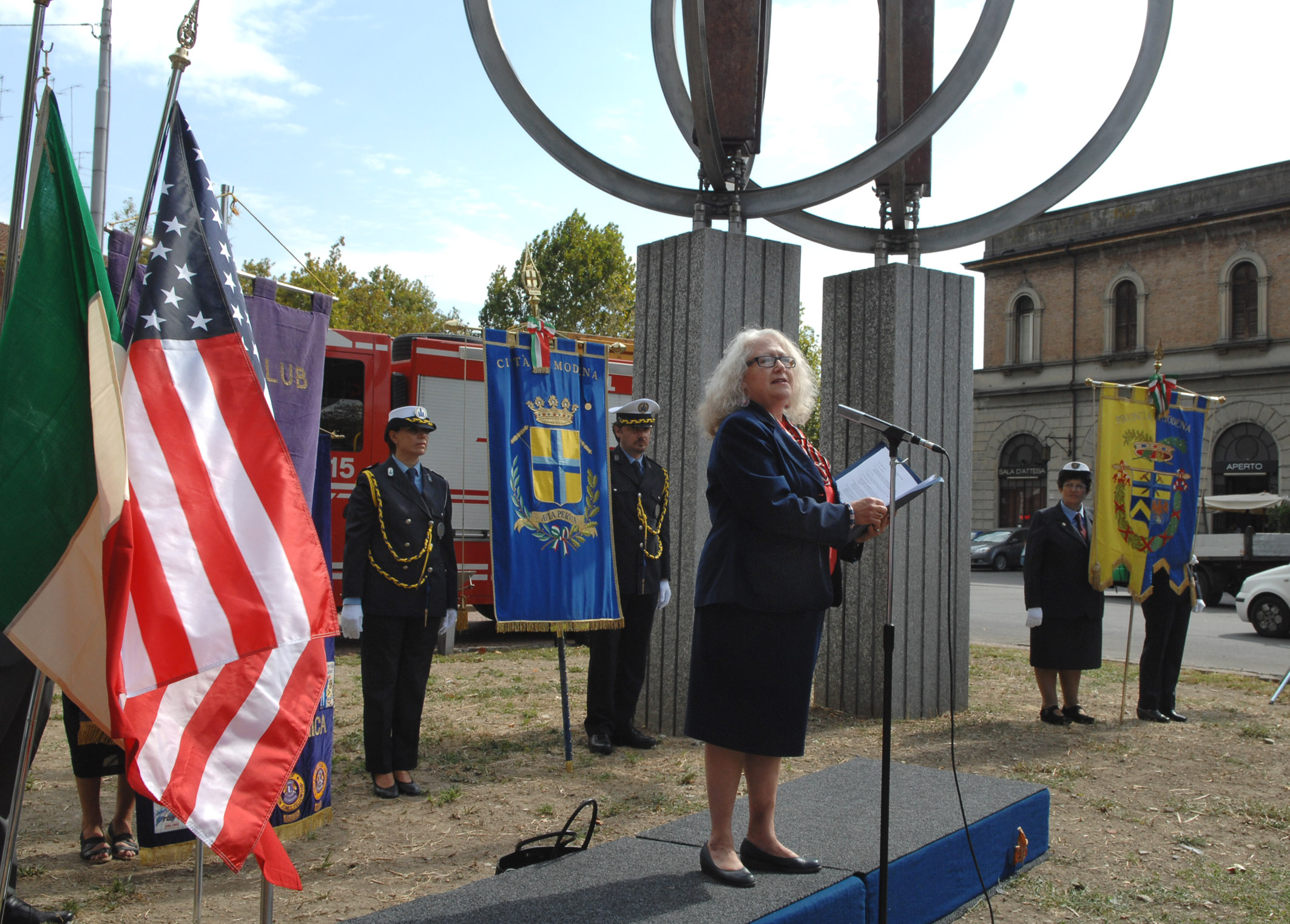 Si è svolta oggi, mercoledì 11 settembre, in piazza Manzoni la cerimonia commemorativa degli attacchi terroristici che l’11 settembre del 2001 che provocarono migliaia di vittime negli Usa. Il console generale degli Stati Uniti d’America Sarah Morrison, il sindaco Giorgio Pighi e il presidente della Provincia Emilio Sabattini, dopo brevi interventi in cui hanno ricordato la tragedia, hanno deposto corone d’alloro al monumento, donato dal Lions Club Modena Estense, che ricorda il crollo delle Torri gemelle del World Trade Center di New York.