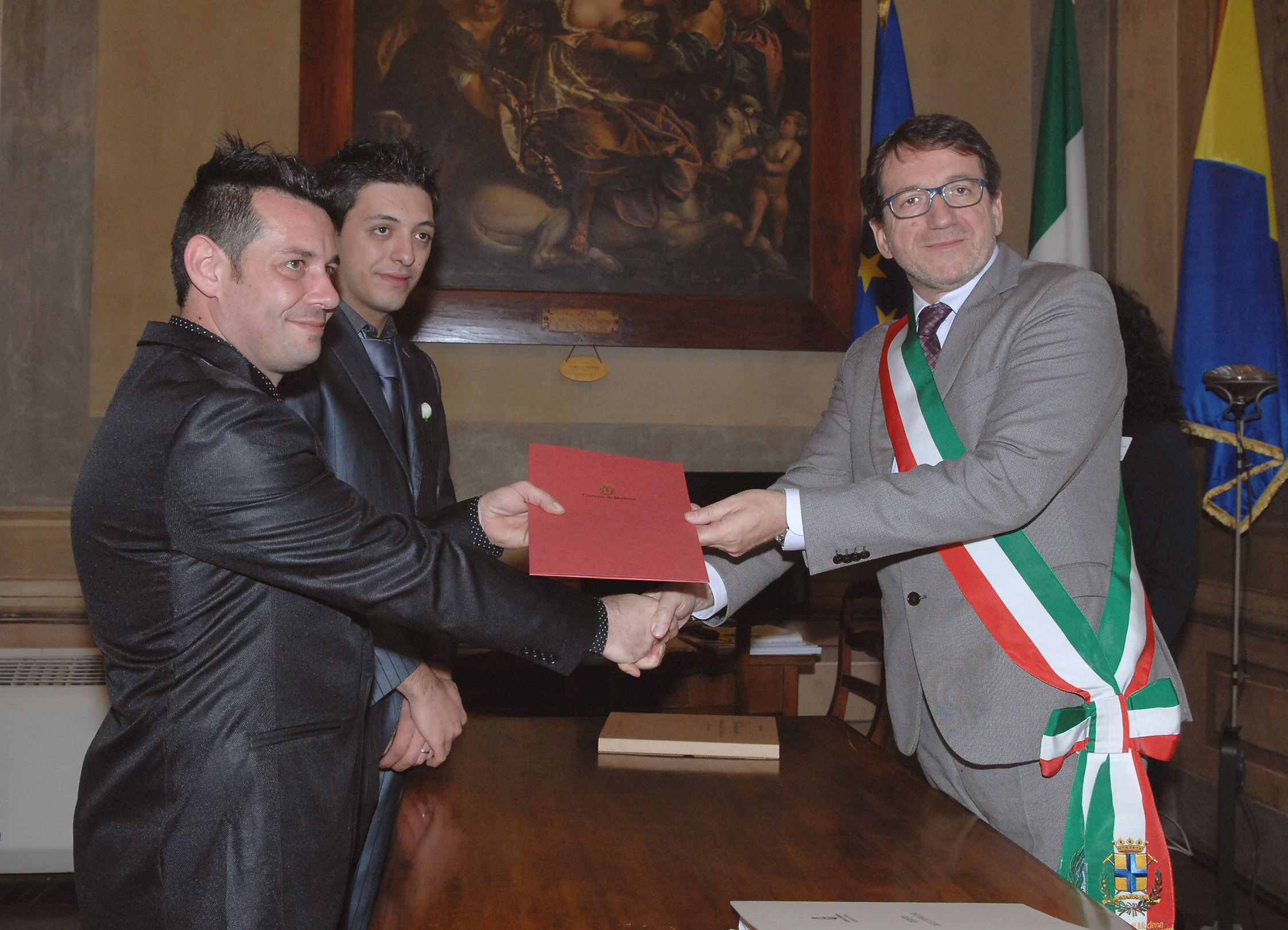 “Con l’atto di oggi ufficializziamo un modo di essere cittadini alla pari nella comunità modenese. Questo registro, di cui voi siete i primi iscritti, consentirà a tutti di uscire dall’anonimato e di essere riconosciuti pubblicamente come coppia”. Lo ha detto il sindaco di Modena Gian Carlo Muzzarelli celebrando giovedì 27 novembre in Municipio la prima iscrizione nel Registro delle unioni civili della città. A registrare per primi, accompagnati dai familiari, la propria dichiarazione di unione sentimentale e coabitazione sono stati Alessio De Gioia, 26 anni, e Andrea Alebbi, 36 anni, giovane coppia omosessuale modenese. Anche la data scelta non è casuale, il 27 novembre ricorre infatti l’anniversario dell’omicidio di Harvey Milk, primo componente delle istituzioni statunitensi apertamente gay e militante del movimento di liberazione omosessuale, ucciso a San Francisco nel 1978.
