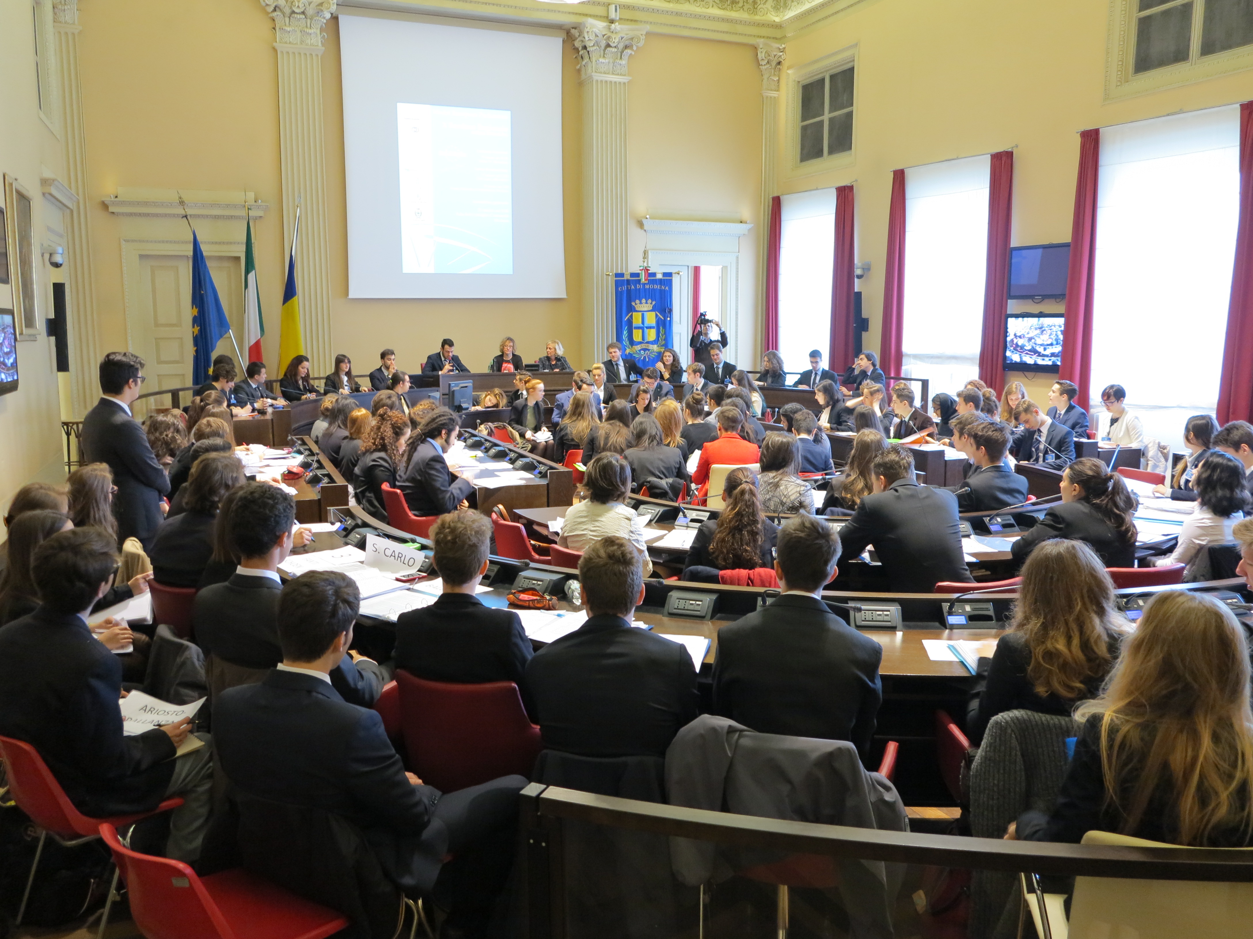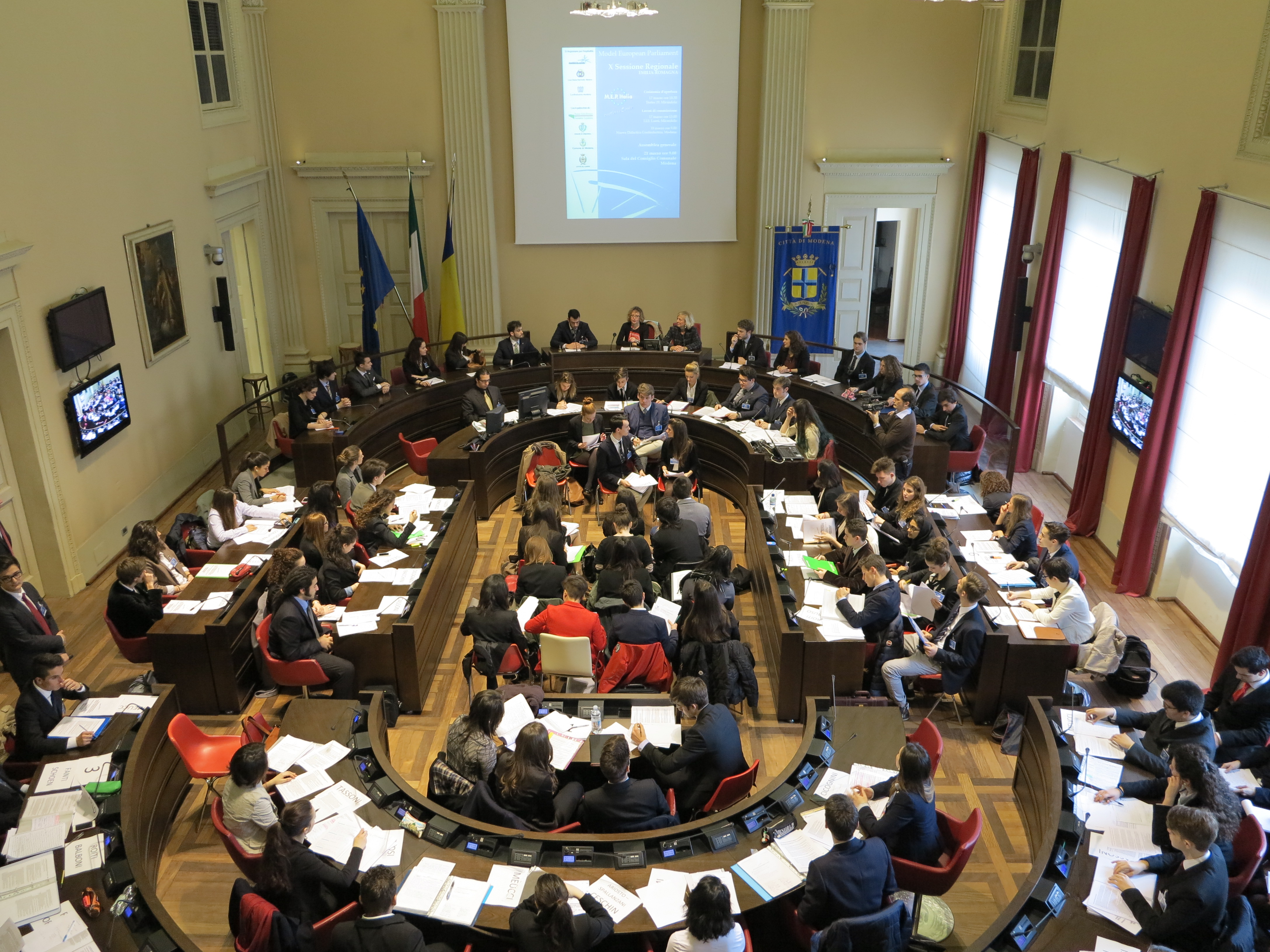 L’illustrazione delle diverse proposte sui temi dell’agenda europea con termini e riferimenti corretti, gli interventi al dibattito rispettando i canonici tre minuti, e anche un tocco di eleganza istituzionale, caratterizzata da giacca e cravatta per i ragazzi e dal tailleur per le ragazze, tutti tra i 16 e i 17 anni. Sono stati loro, infatti, insieme ai tutor universitari, i protagonisti dell’assemblea plenaria della sessione regionale di simulazione del Parlamento Europeo che si è svolta oggi, venerdì 21 marzo, nella sala del Consiglio comunale di Modena.
