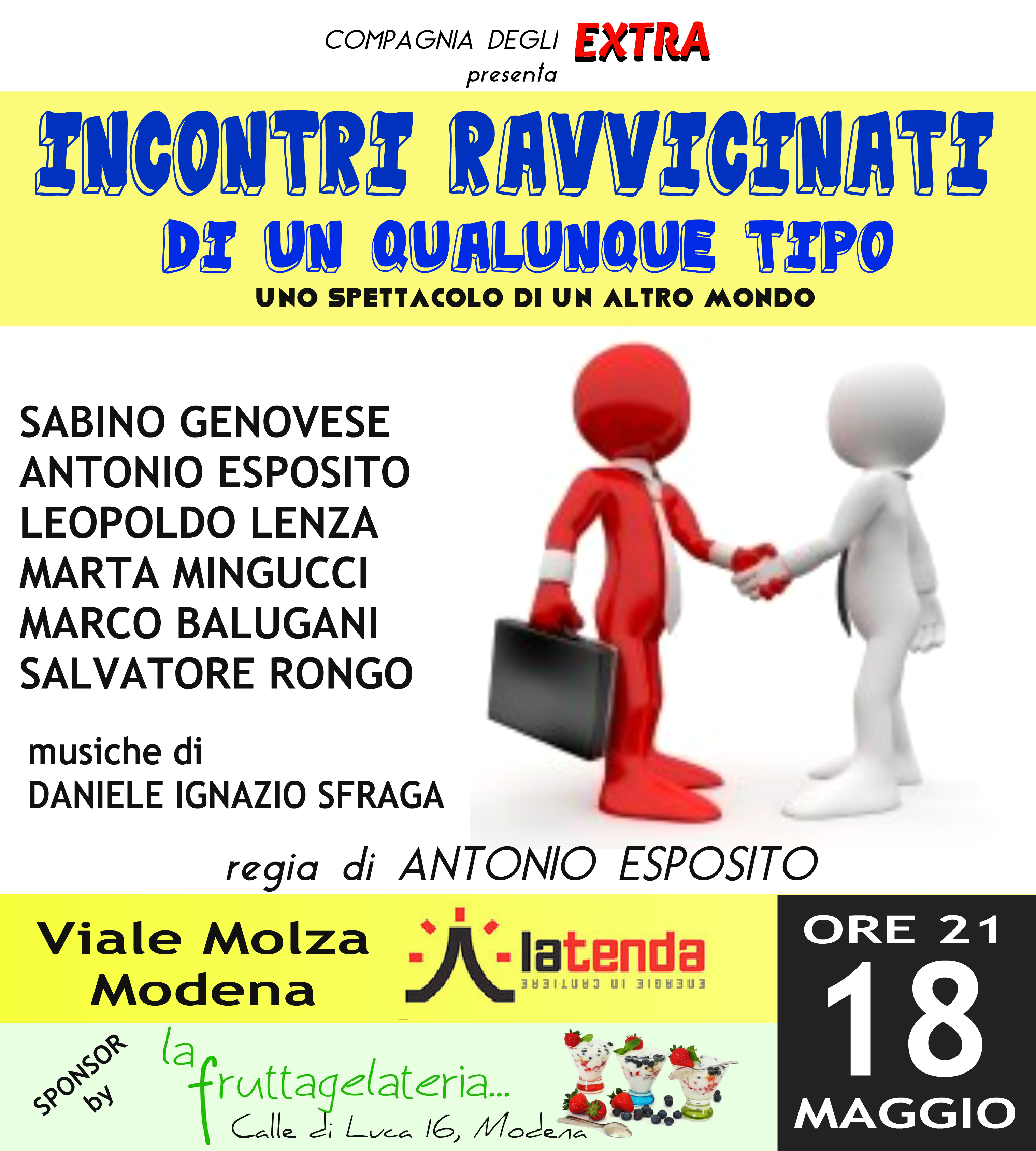 con Antonio Esposito, Marta Mingucci, Sabino Genovese, Leopoldo Lenza, Salvatore Rongo, a cura della Compagnia teatrale degli Extra. In programma uno spettacolo tutto da ridere e adatto alle famiglie, che parla di incontri senza tempo e senza spazio, di incontri tra uomini e donne, ma anche tra le persone e i loro sogni o il loro destino, incontri tra umani e disumani o tra umani ed extraterrestri.