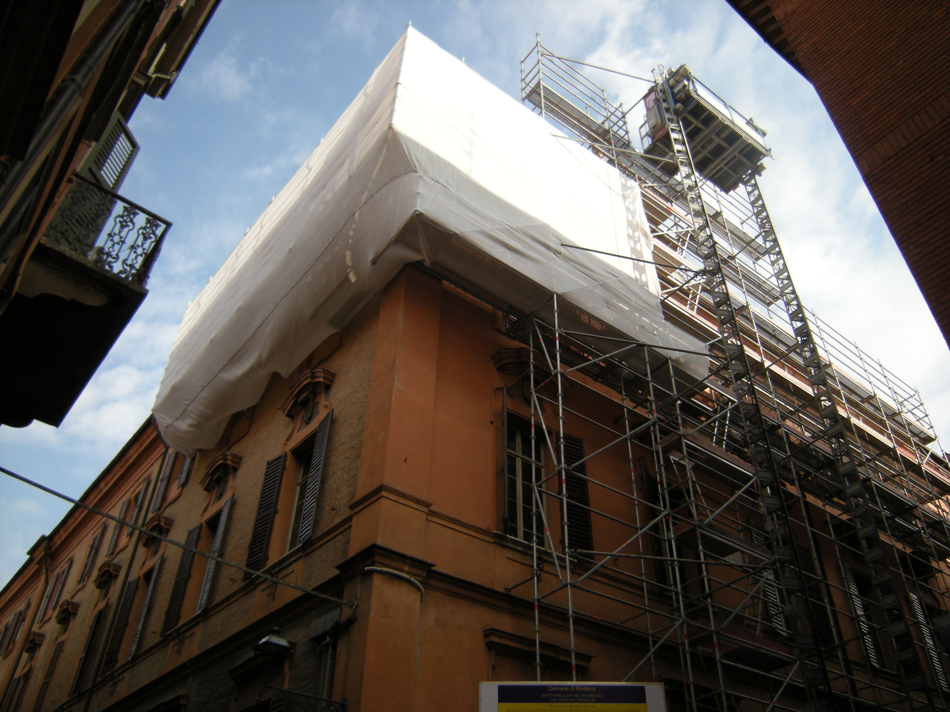 Il Palazzo comunale di Modena è sottoposto in queste settimane a un intervento di messa in sicurezza e riqualificazione. Dal 5 maggio, infatti, è aperto un cantiere edile tra via Scudari e via Castellaro per la ristrutturazione delle coperture del lato sud est del Palazzo comunale, adiacente il cavedio che dà luce agli uffici interni del secondo e terzo piano e, attraverso una copertura semisferica in vetro e cemento, anche a un’attività commerciale al piano terra.