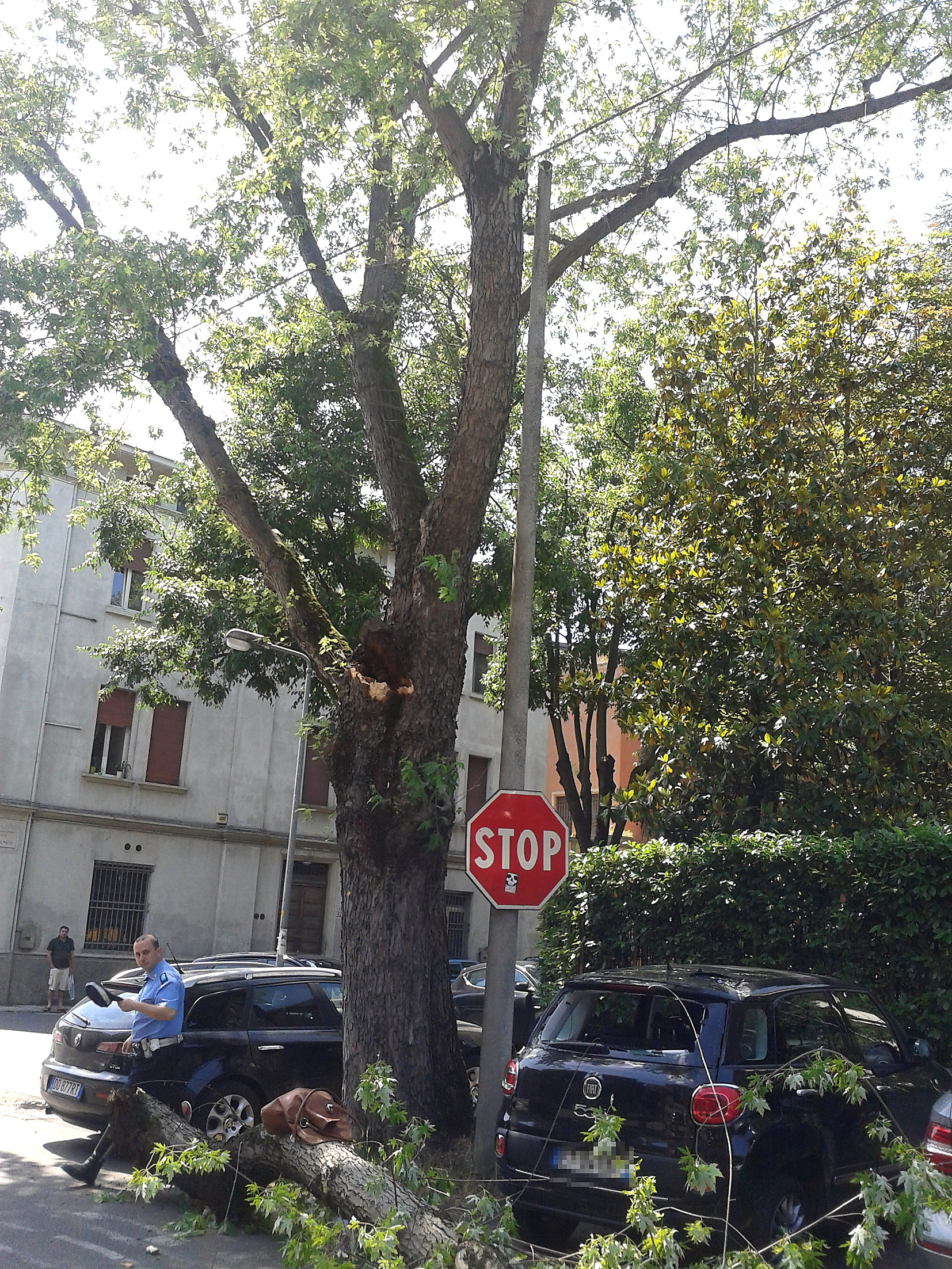 Un ramo di circa otto metri si è schiantato improvvisamente cadendo su un’auto in sosta. E’ avvenuto alle 14 di oggi, giovedì 29 maggio, a Modena in via Sabbatini nei pressi dell’incrocio con via Malmusi. Nessuna persona è rimasta coinvolta. Sul posto sono intervenuti i tecnici comunali che hanno messo in sicurezza la pianta, un Acero Saccarino, che domani sarà abbattuto.