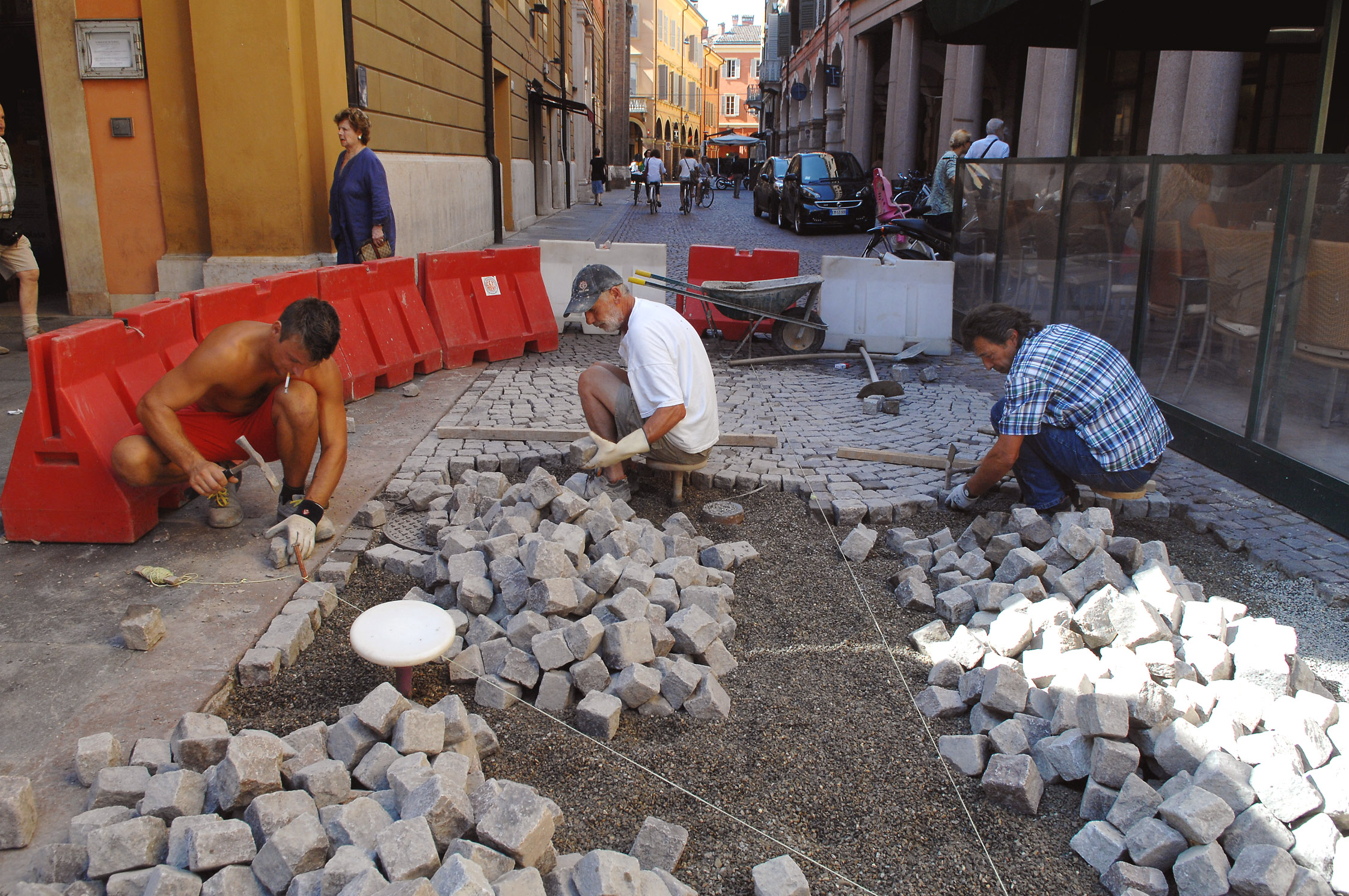 L'area interessata al ripristino è di circa 350 metri quadrati e i lavori si svolgono in tre distinte fasi: la scarifica dell’asfalto e la preparazione del fondo; la posa dei cubetti di porfido e la saturazione con polvere di sasso, il consolidamento della pavimentazione con transito consentito solo a pedoni e biciclette fino alla riapertura della strada che avverrà venerdì 22 agosto. La posa dei cubetti di porfido è iniziata in via San Carlo, nel tratto dell’incrocio con via Emilia centro.