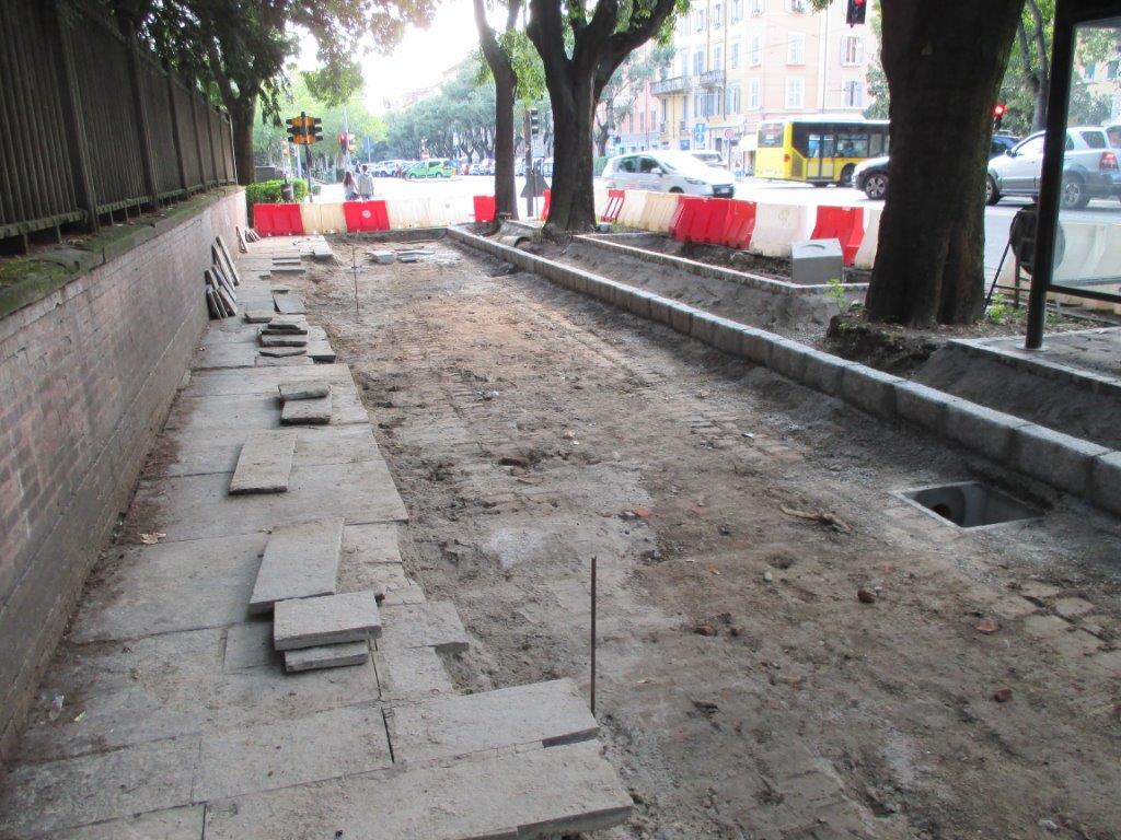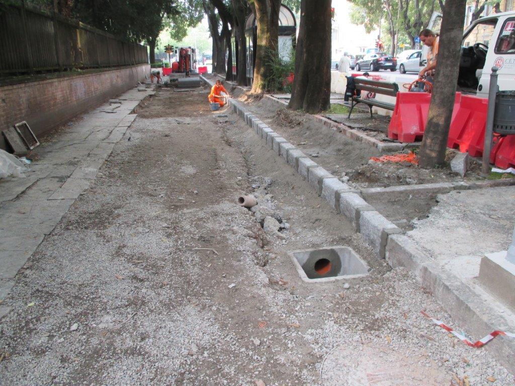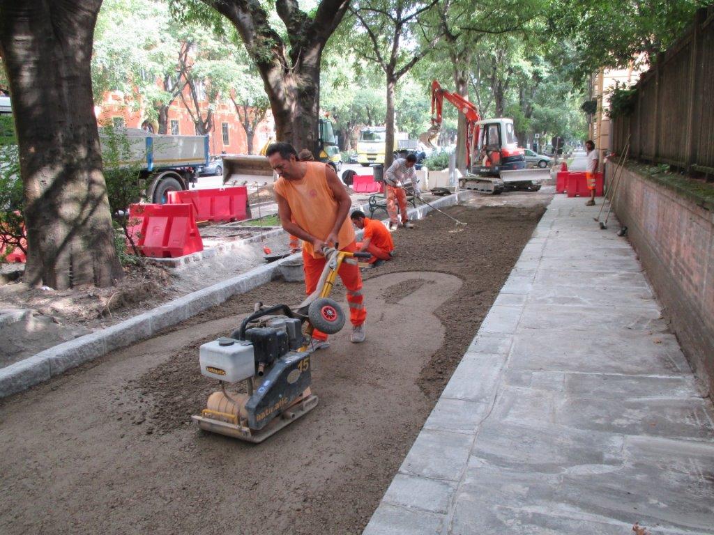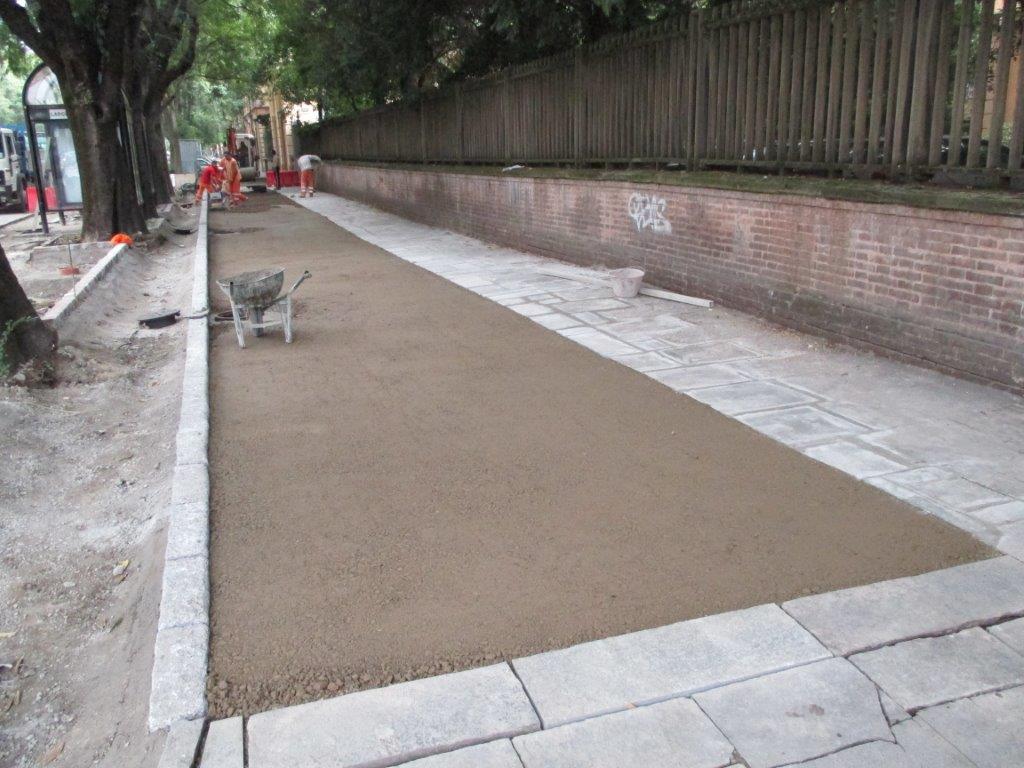 I lavori, che hanno comportato una spesa complessiva di 34.160 euro, hanno previsto il ripristino della pista ciclabile e delle pertinenze, con la rimozione degli elementi di ostacolo alla circolazione delle biciclette, la posa di nuovi cordoli in granito ed in binderi di porfido anche a contenimento dell’aiuola al confine con il viale, la posa di nuovo terreno nelle stesse aiuole, la demolizione e il rifacimento di marciapiedi in lastre di lucerna e l’abbattimento delle barriere architettoniche, la costruzione di blocchi di fondazione per nuovi pali di illuminazione pubblica, e l’installazione di panchine. Tra gli interventi, anche la demolizione e riasfaltatura del pavimento delle pensiline dei bus e l’asfaltatura dell’incrocio tra via Papazzoni e Grimelli, il ripristino di caditoie intasate e la costruzione di fognoli per l’inserimento di quattro nuove caditoie, la delimitazione del tracciato della pista ciclabile e la stesura di ghiaia come nei tratti adiacenti, il riposizionamento della segnaletica verticale relativa alla pista e il rifacimento della segnaletica orizzontale all'incrocio tra ciclabile e strade.