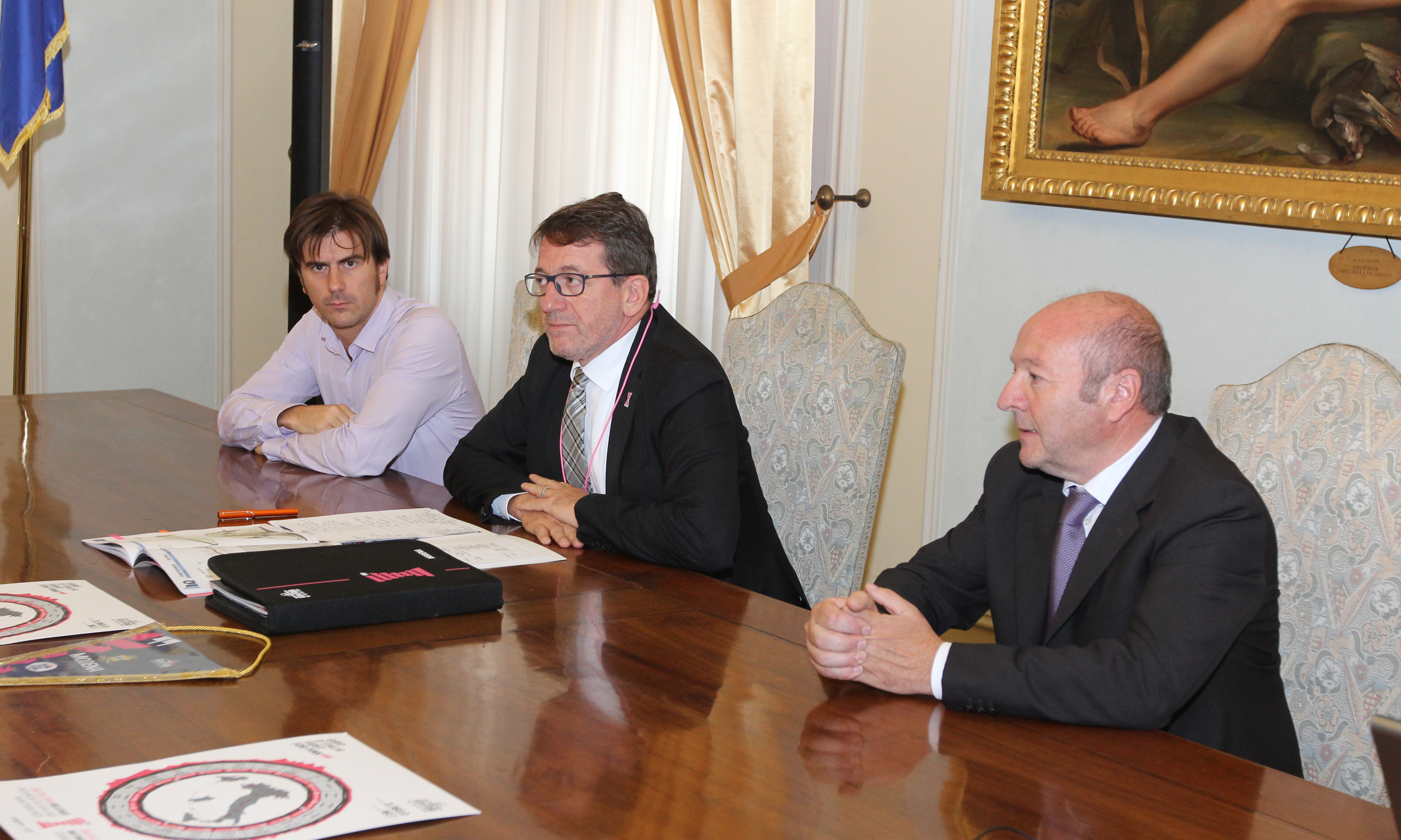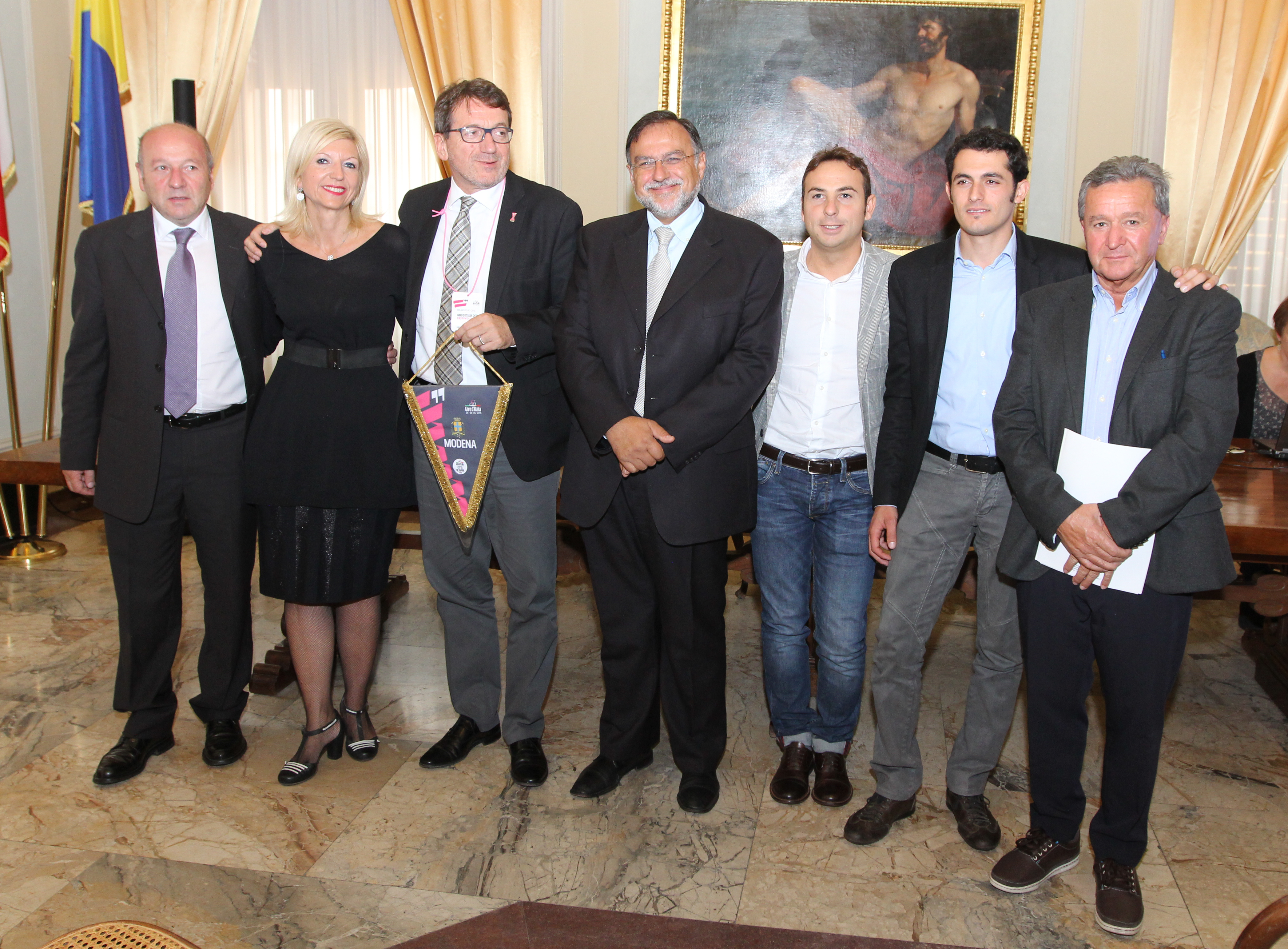 “È una straordinaria opportunità di promozione e valorizzazione per il territorio provinciale”, è il commento dei sindaci di Modena e di Sestola, Gian Carlo Muzzarelli e Marco Bonucchi, e dell’assessore comunale allo Sport Giulio Guerzoni che, insieme agli amministratori degli altri Comuni interessati dalla gara, martedì 6 ottobre, in Municipio, hanno presentato la 99ª edizione del Giro, dopo quella nazionale all’Expo di Milano: “Un’occasione che vogliamo cogliere fino in fondo. Inizia ora infatti un periodo di lavoro per costruire un programma di iniziative ed eventi che vedrà il coinvolgimento di tutti i 13 comuni interessati dal passaggio della corsa per dare una vetrina a tutte le eccellenze del territorio”. In rappresentanza dei Comuni, alla presentazione sono intervenuti i sindaci di Montese Luciano Mazza, di Polinago Gian Domenico Tomei, di Montecreto Leandro Bonucchi, di Fanano Stefano Muzzarelli, di Nonantola Federica Nannetti, e il vice sindaco di Marano Giovanni Galli.