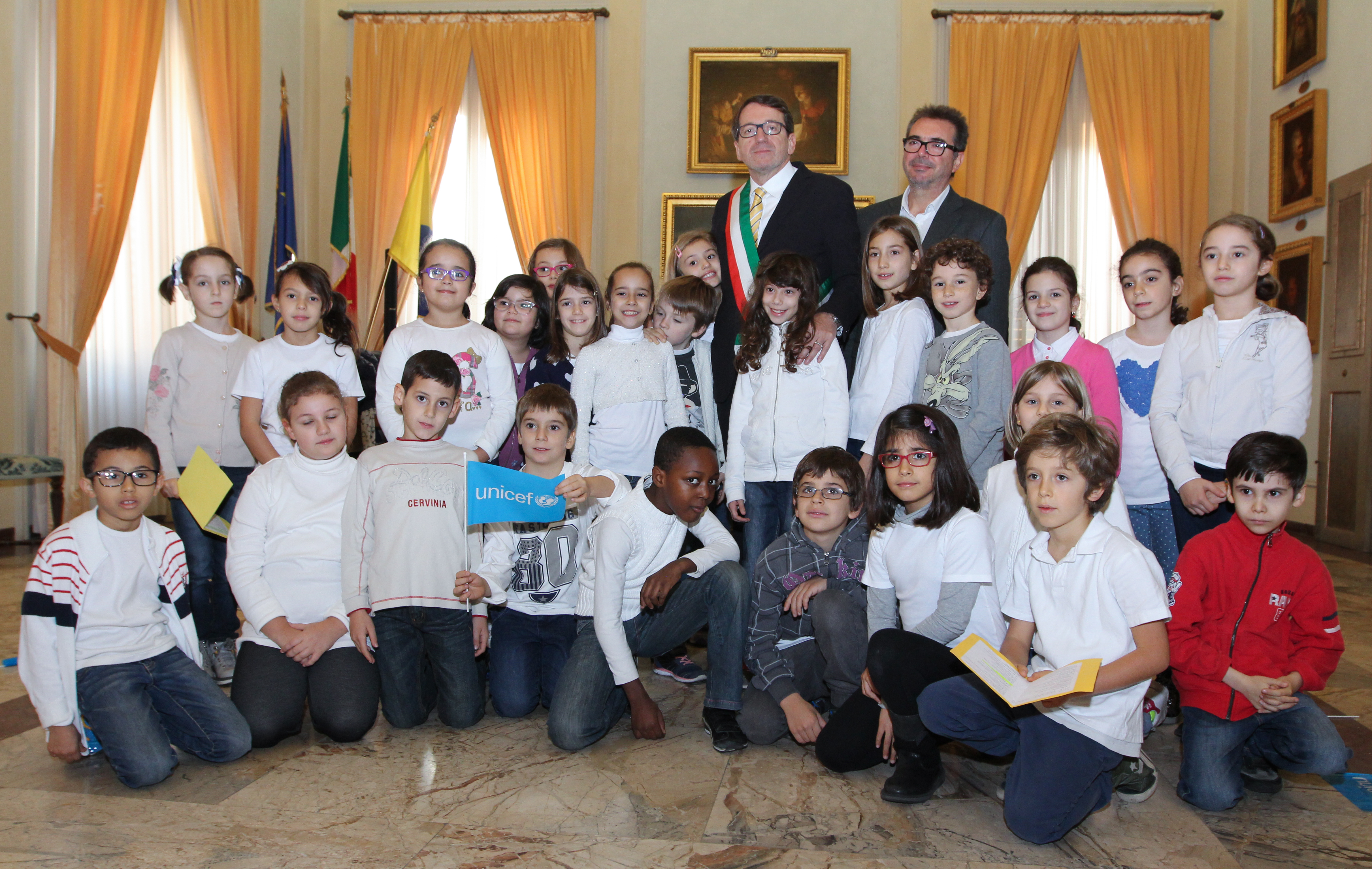 Sono arrivati in Municipio sventolando le bandierine blu dell’Unicef armati dei loro sorrisi e della loro allegria i bambini della terza B delle scuola primarie S. Agnese di Modena. E, in occasione del 26esimo anniversario dell’approvazione della Carta dei Diritti dell’infanzia e dell’adolescenza, che il mondo festeggia oggi venerdì 20 novembre, al sindaco Gian Carlo Muzzarelli e al vicesindaco Gianpietro Cavazza hanno consegnato il vademecum 2015 dell’Unicef intitolato “Ogni bambino merita una possibilità”.