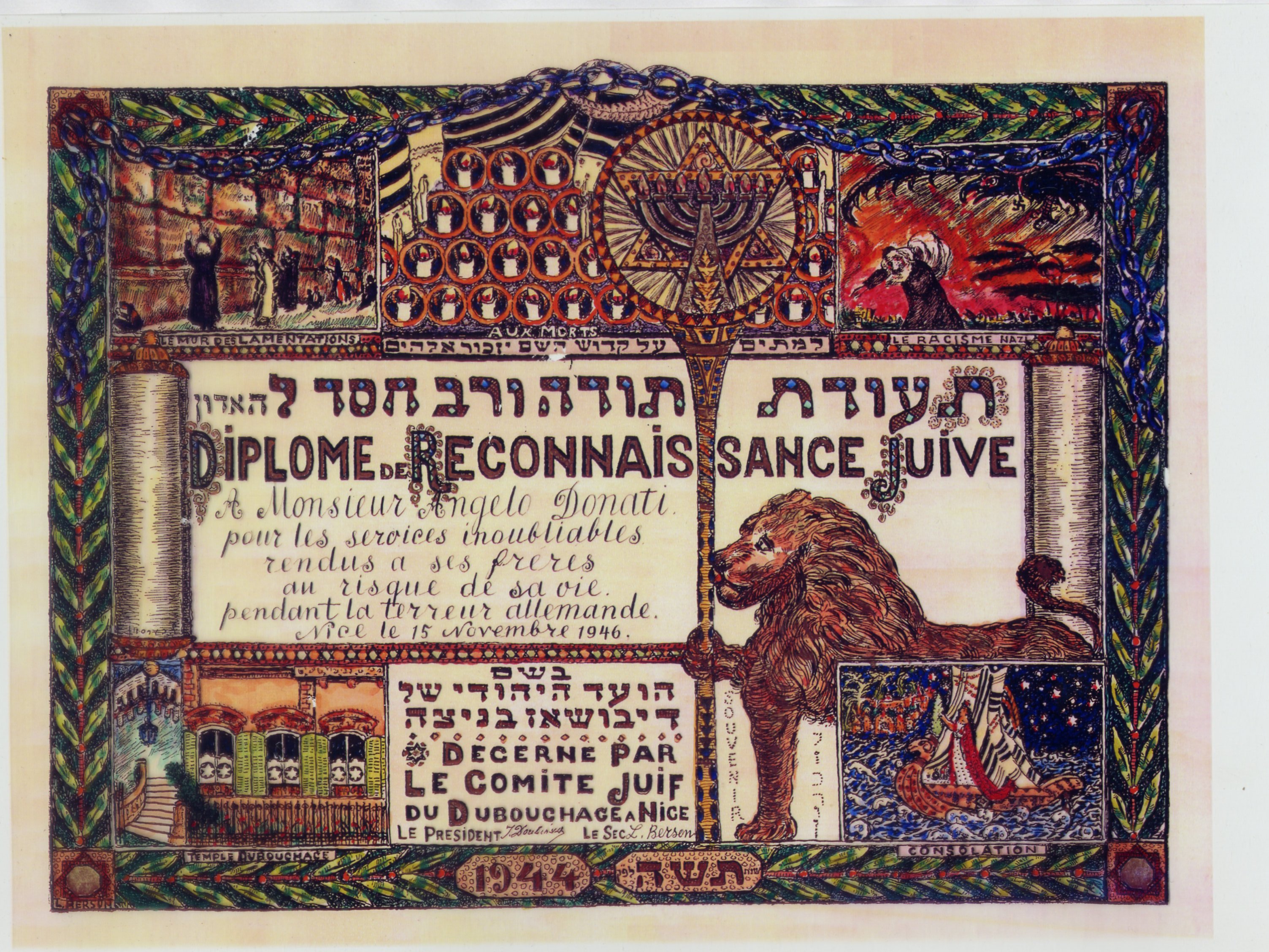 Angelo Donati nasce a Modena il 3 febbraio 1885 da una famiglia ebrea da tempo integrata nel contesto sociale ed economico della città. Modenese da generazioni, trascorre parte della sua vita a Parigi, dove era giunto durante la Prima Guerra Mondiale come Ufficiale di Collegamento tra l’esercito italiano e quello francese. Impegnato in attività finanziarie e imprenditoriali, a partire dagli Anni Venti ricopre in Francia importanti ruoli diplomatici e consolari per l’Italia e la Repubblica di San Marino, e dal 1933 inizia la sua attività di aiuto in favore degli ebrei nella Germania nazista. Nel 1940 si trasferisce a Nizza e diventa il principale punto di riferimento per il salvataggio di migliaia di perseguitati ebrei. Insignito della onorificenza di Grand’Ufficiale della Corona d’Italia e di quella sanmarinese di Commendatore dell’Ordine di Sant’Agata, nominato dal Governo francese Commendatore della Legion d’Onore, nel 2004 riceve dal Presidente della Repubblica italiana “in memoria” (Angelo Donati muore nel 1960) la Medaglia d’oro al Merito civile per le coraggiose e generose azioni compiute per salvare numerosissimi ebrei durante la Shoah: “Durante il secondo conflitto mondiale, nella zona della Francia, occupata dalle truppe italiane, Angelo Donati, con indomito coraggio, ottenne di salvare, con la collaborazione delle autorità civili e militari italiane, migliaia di ebrei di diverse nazionalità, proteggendo per lunghi mesi le loro vite minacciate dalla deportazione nei campi di sterminio nazisti. Con generosità d’animo e appassionato impegno diede viva e coerente testimonianza dei valori di libertà e giustizia. Nobile e fulgido esempio di elette virtù civiche.”