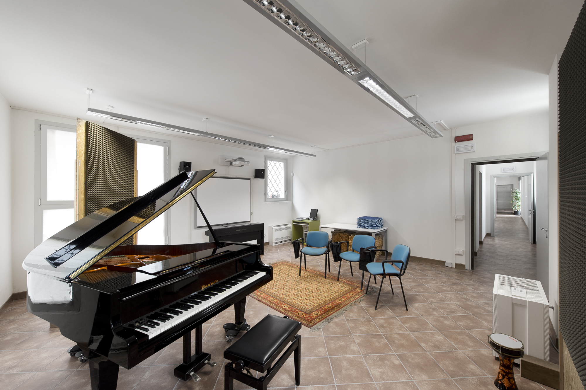 Un pianoforte a coda Bechstein e una completa dotazione multimediale completano le dotazioni dello spazio. Tutto il progetto rispetta le normative in materia di disabili motori e visivi. Al secondo piano trovano collocazione anche l’ufficio direzione Cubec, la segreteria e i servizi.