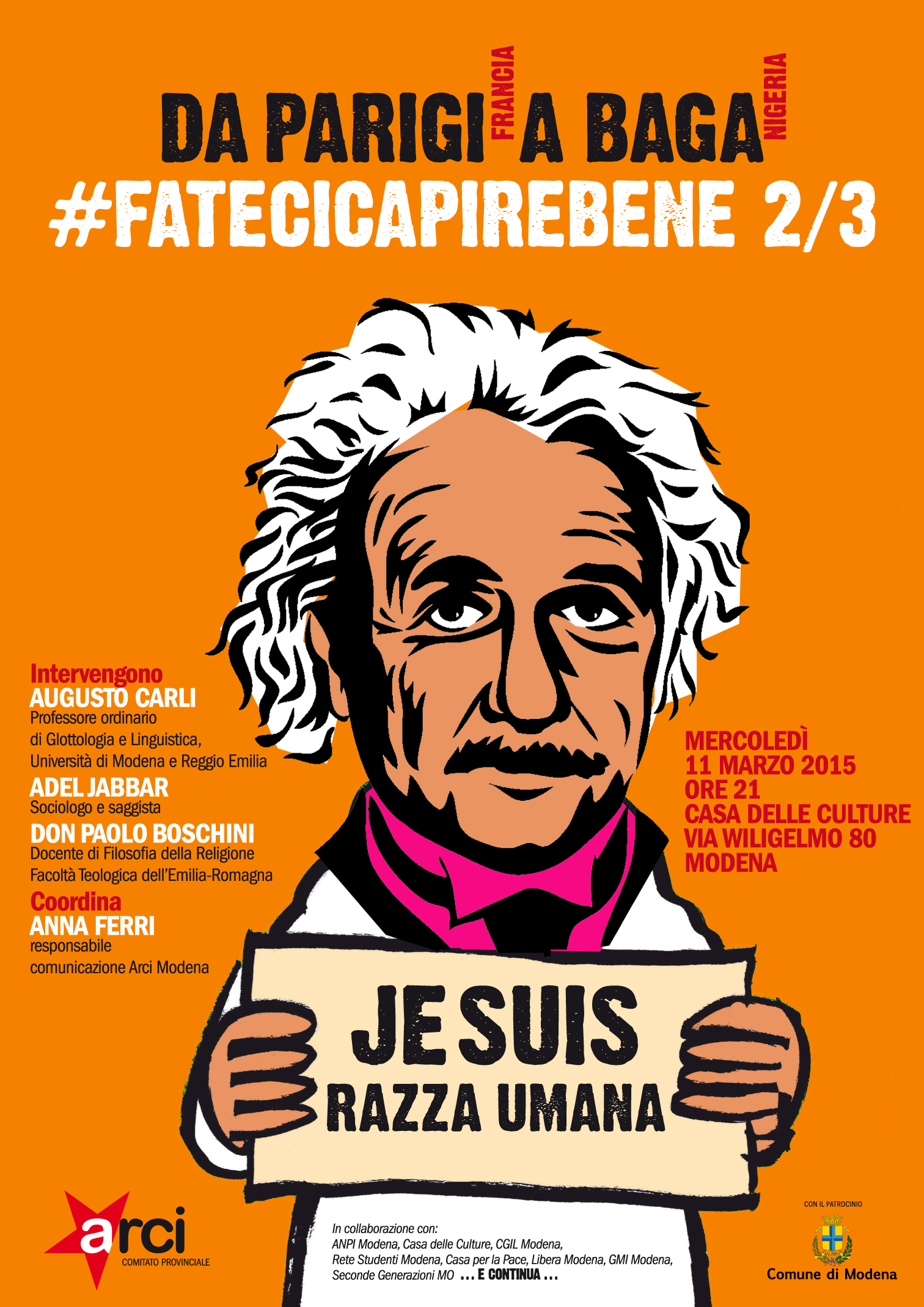 Prenderà il via da un confronto sulla risposta che la società civile ha dato agli attacchi terroristici contro la sede del giornale Charlie Hebdo di Parigi il 7 gennaio e nei giorni successivi il secondo incontro di “Je suis razza umana” in programma mercoledì 11 marzo alle 21 alla Casa delle Culture di Modena, in via Wiligelmo 80. Il quadro storico, il punto di vista della Chiesa Cattolica e il peso che hanno le parole nel contesto multiculturale sono i temi principali dell’appuntamento organizzato da Arci e Comune di Modena per riflettere su quanto accaduto in Francia con uno sguardo alla Nigeria e al Medio Oriente.