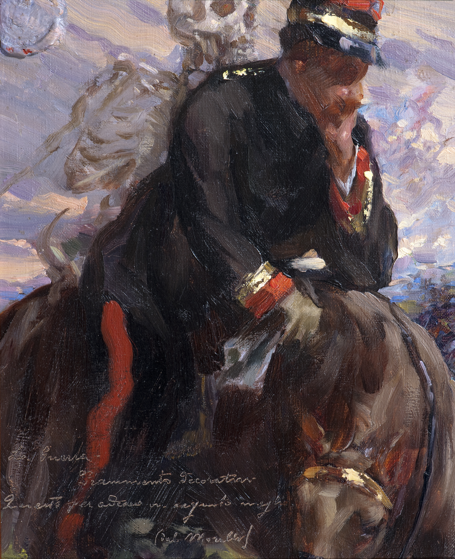Aldo Lugli raffigura un carabiniere colto in un atteggiamento pensoso con la morte in forma di scheletro che incombe su di lui. Si tratta, quindi, di un tragico “memento mori”, di una riflessione sull'ineluttabile destino della guerra a cui è peraltro riservata la copertina del catalogo della mostra.
