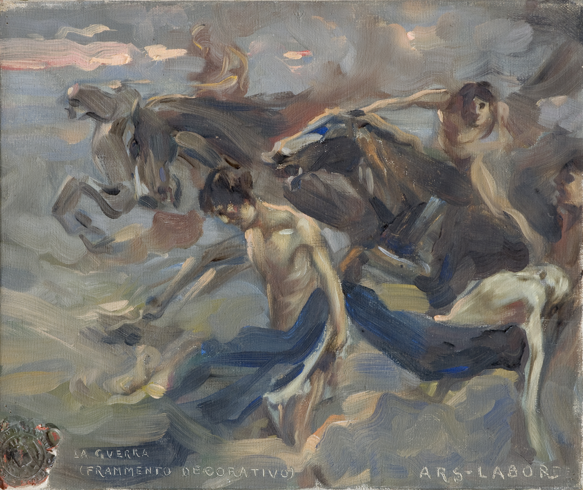 Si tratta di opere di Aldo Lugli, Mario Vellani Marchi e Arcangelo Salvarani aventi per tema la guerra. In particolare, i piccoli dipinti di Lugli e Vellani Marchi furono realizzati nell'ambito del Concorso Poletti di Pittura, che assegnò per una delle prove del 1914 il tema “La Guerra”, prima del coinvolgimento dell'Italia nel conflitto, a partire dall'estate del 1915.