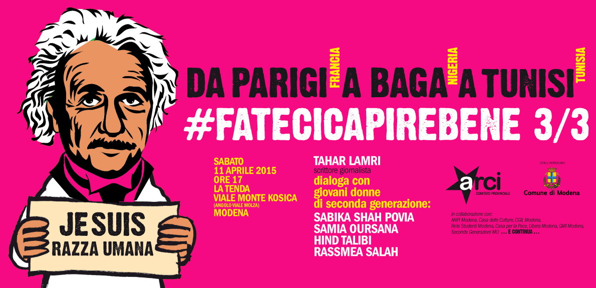 Ci saranno le seconde generazioni al centro dell’ultimo appuntamento con “Je suis razza umana” in programma sabato 11 aprile alle 17 a La Tenda di viale Molza a Modena. La storia di chi è nato in Italia da genitori immigrati, tra nuove identità e tradizione, nelle parole di quattro giovani donne italiane musulmane: Sabika Shah Povia, Samia Oursana, Hind Talibi e Rassmea Salah, che dialogheranno con il giornalista e scrittore Tahar Lamri su quanto è accaduto il 7 gennaio scorso a Parigi con la strage nella redazione del settimanale Charlie Hebdo, senza dimenticare le guerre in Medio Oriente e l’attentato a Tunisi.