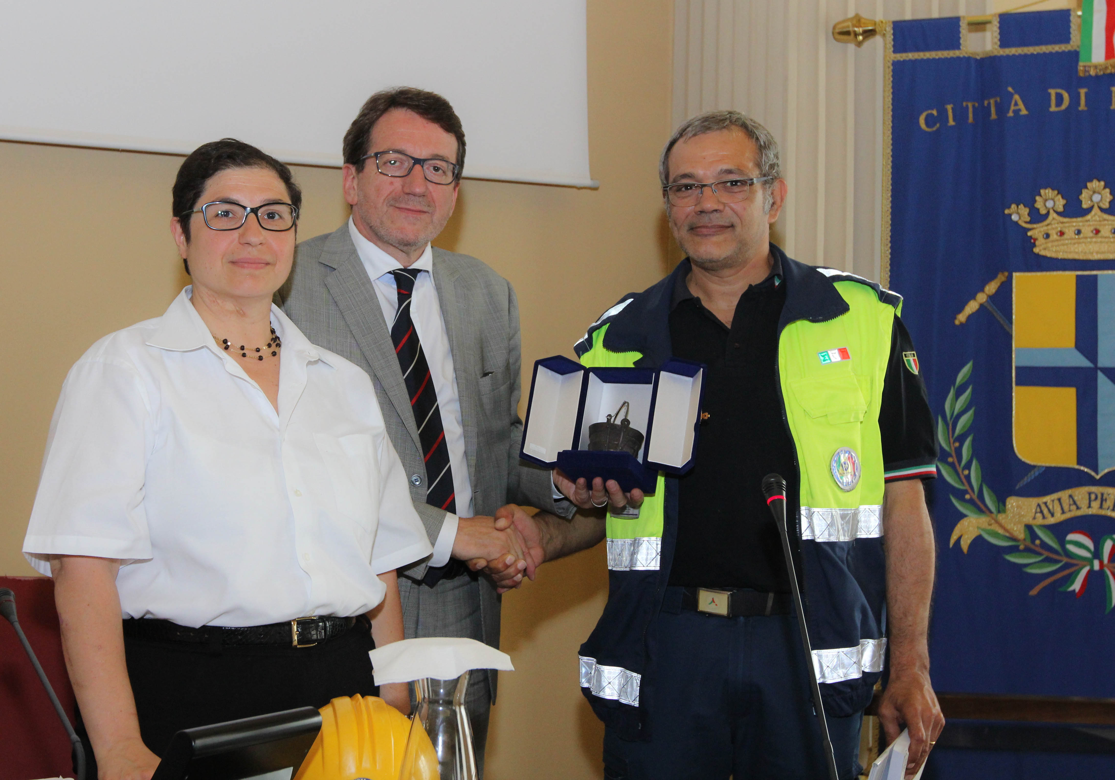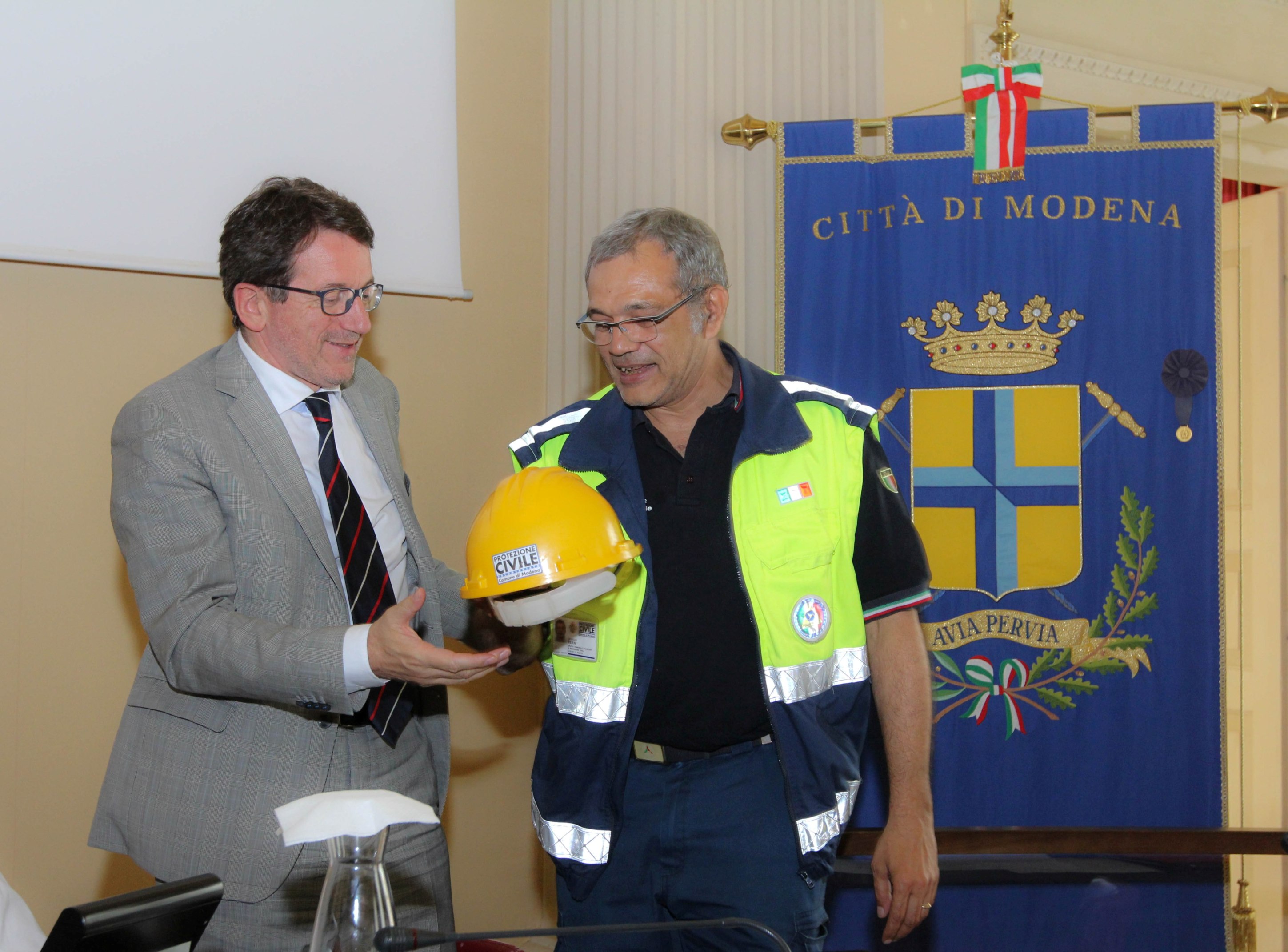 È stato celebrato in Consiglio comunale, giovedì 11 giugno, il quindicesimo compleanno del Gruppo volontari di Protezione civile del Comune di Modena. Il sindaco Gian Carlo Muzzarelli e la presidente del Consiglio Francesca Maletti hanno incontrato i volontari, coordinati da Giorgio Berni, insieme all’assessore all’Ambiente Giulio Guerzoni e a Rita Nicolini, responsabile provinciale della Protezione civile. Al Gruppo volontari il sindaco, a nome dell’Amministrazione e della città, ha consegnato un attestato di ringraziamento e riconoscenza per l’opera svolta sulla dimensione cittadina e provinciale, e una riproduzione della Secchia rapita, ricevendo in cambio un casco giallo di protezione.