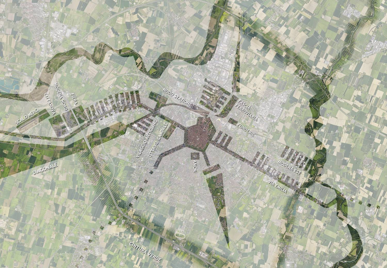 Gli assi di lavoro principali delineati dall’assessora all’Urbanistica Anna Maria Vandelli introducendo il percorso del Psc riguardano il fuori città (la riconquista del paesaggio agrario e rurale, la cintura verde, gli ambiti fluviali); il sistema ovest/est che ha nella Diagonale e nella via Emilia gli assi portanti (qui si appoggiano i progetti più rilevanti: scalo merci, Cittanova, Modena Nord, Ottavo campale) e rafforza il ruolo baricentrico del centro storico; il sistema nord/sud che prosegue ed implementa le azioni di riqualificazione della fascia ferroviaria (nodo stazione) e verso sud (ex Amcm).
