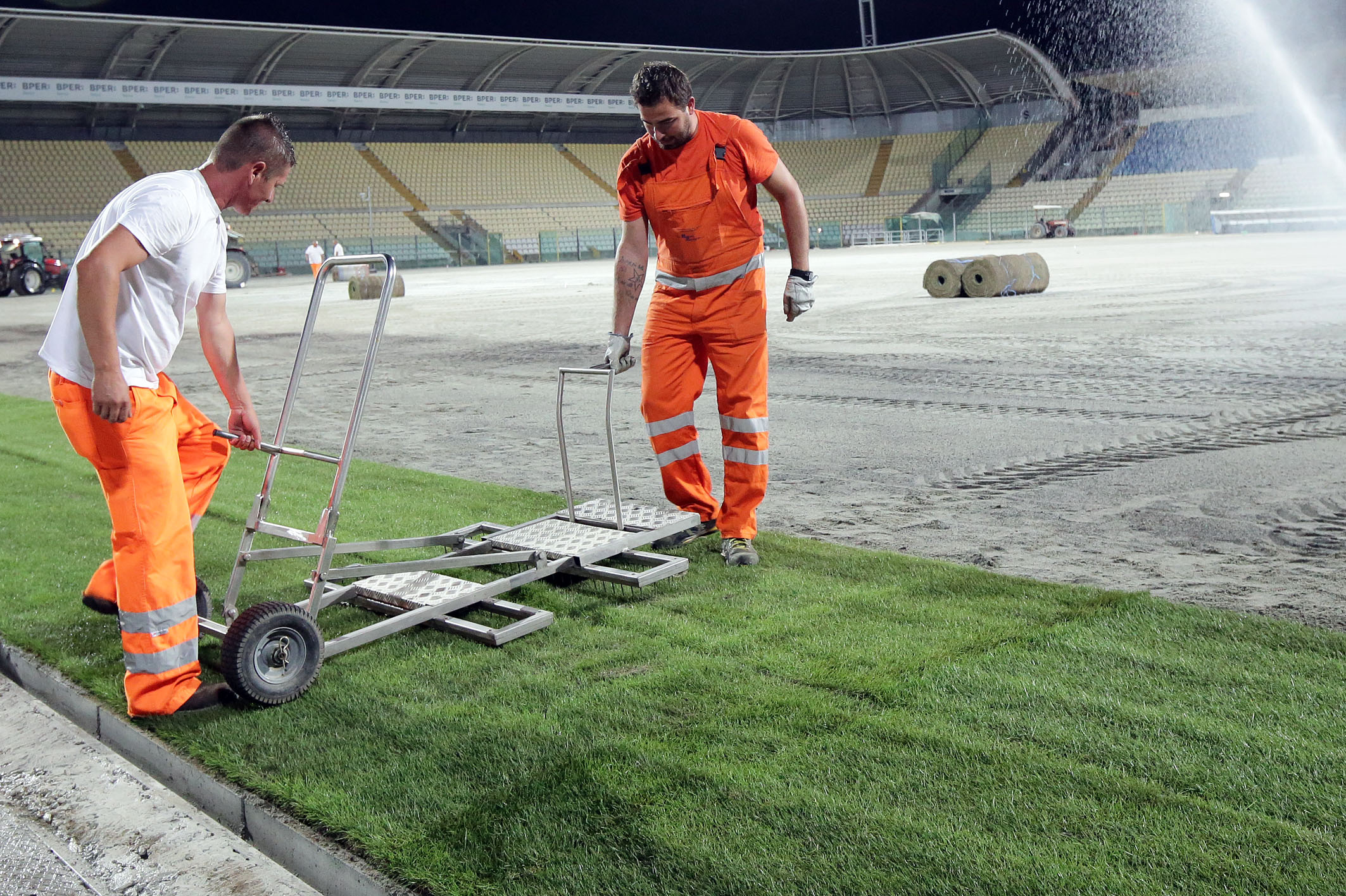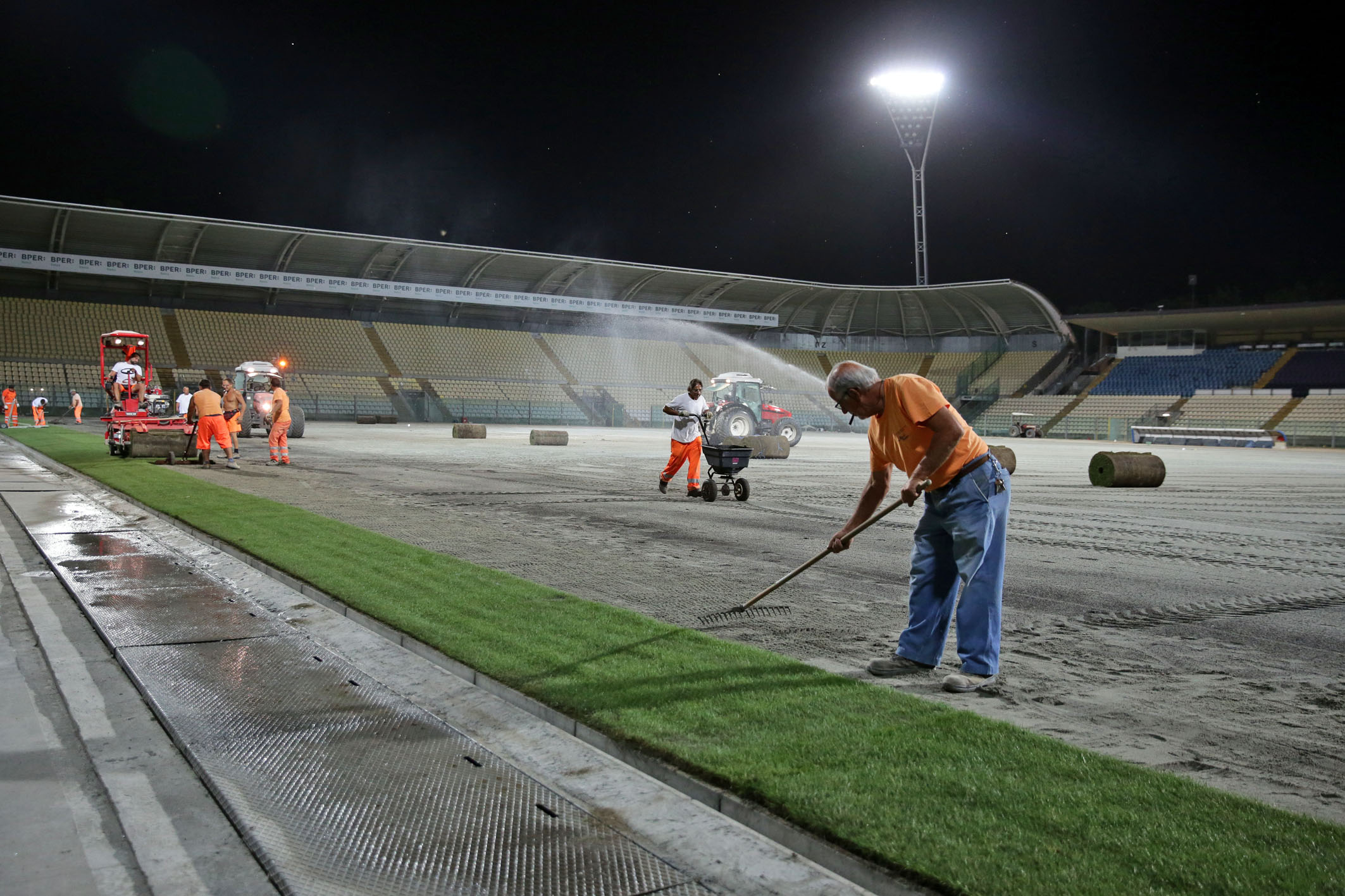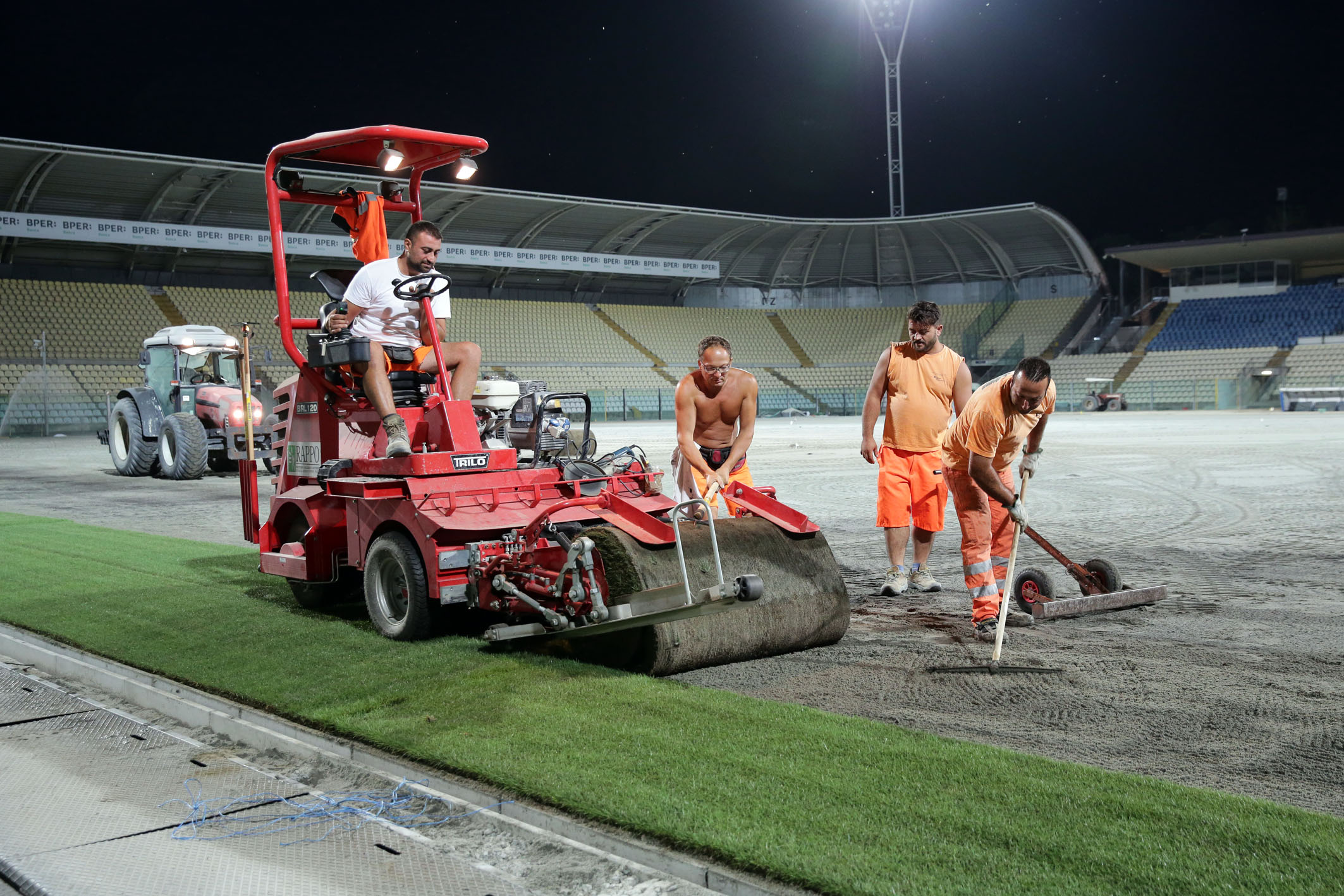 Partono da Milano in tarda serata, quando è più fresco, e arrivano a Modena a bordo di grandi camion, da cui vengono scaricati e srotolati sopra la sabbia del nuovo terreno di gioco. Sono i rotoli di manto erboso misto (85 per cento erba naturale rafforzata con 15 per cento di sintetico) del campo dello Stadio Alberto Braglia di Modena, la cui posa ha preso avvio nella notte tra lunedì 17 e martedì 18 agosto.