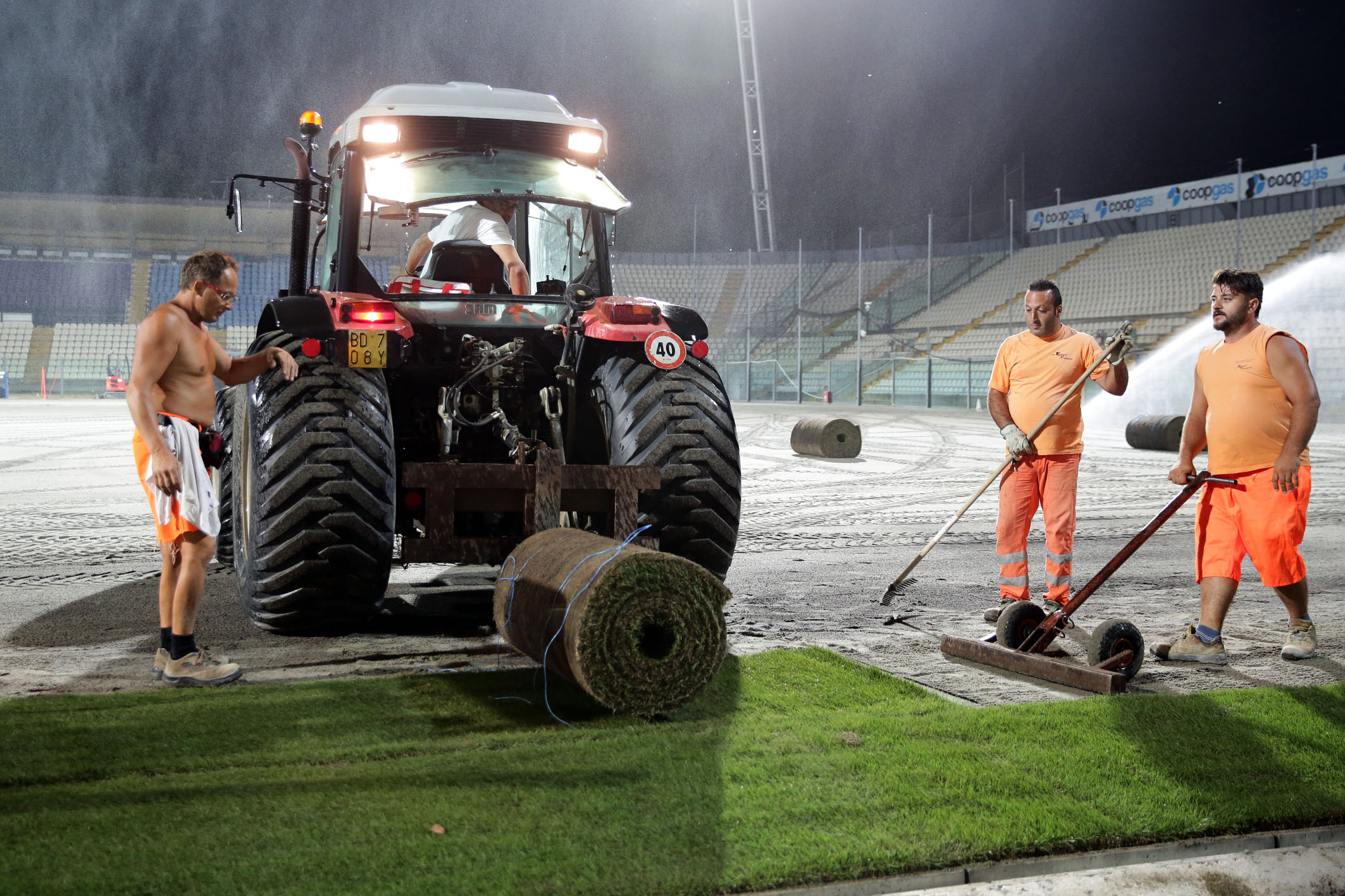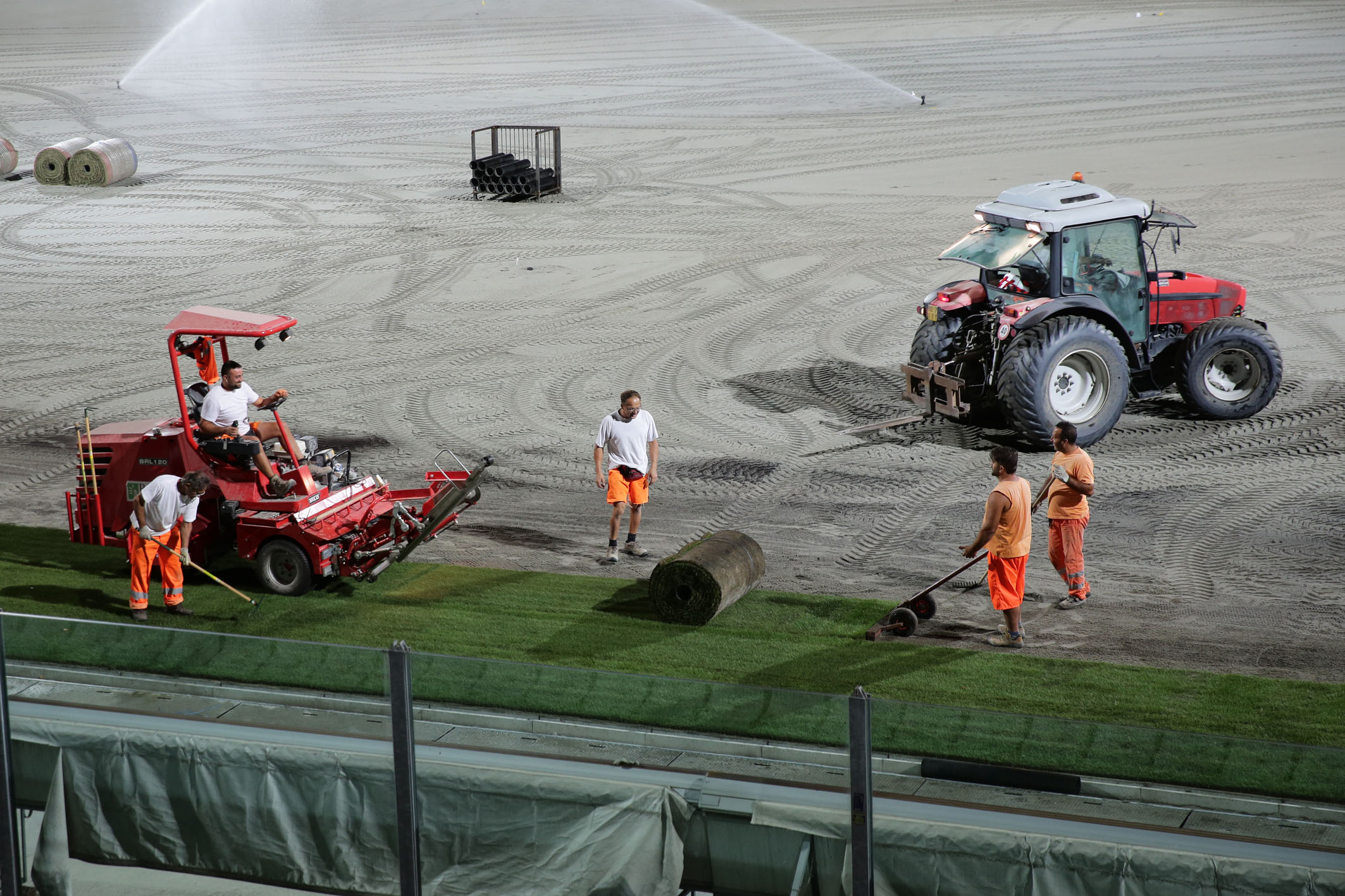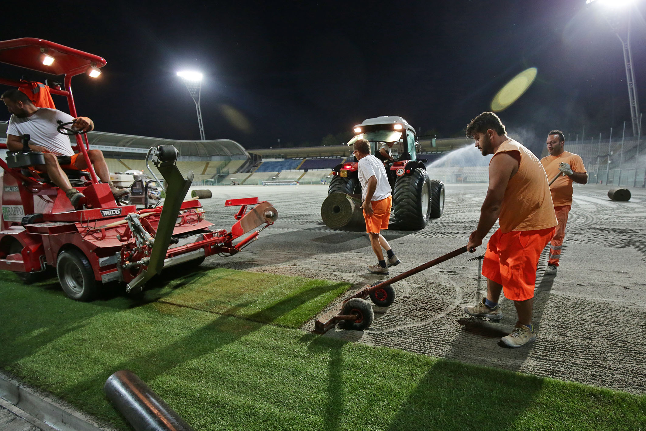 Dopo i lavori di sbancamento e rimozione dell’erba sintetica del precedente campo, il rifacimento del sottofondo, del sistema di drenaggio per la raccolta e lo smaltimento delle acque, dell’impianto di irrigazione e la posa delle serpentine per il riscaldamento anti ghiaccio, in questi giorni gli impianti sono stati coperti con sabbia ed è ora iniziata la posa del manto erboso, rigorosamente di notte per consentirne una miglior conservazione. L’intervento, che nella prima notte ha visto la posa di circa 3.000 metri quadrati di manto erboso, richiederà tre o quattro giorni di attività. Di giorno il manto viene innaffiato e asciugato di continuo per consentirgli di attecchire più facilmente. L’azienda che sta svolgendo i lavori è una delle poche certificate in Italia per l’utilizzo di questo materiale ed è la stessa che ha lavorato al campo dello stadio Bernabeu di Madrid.