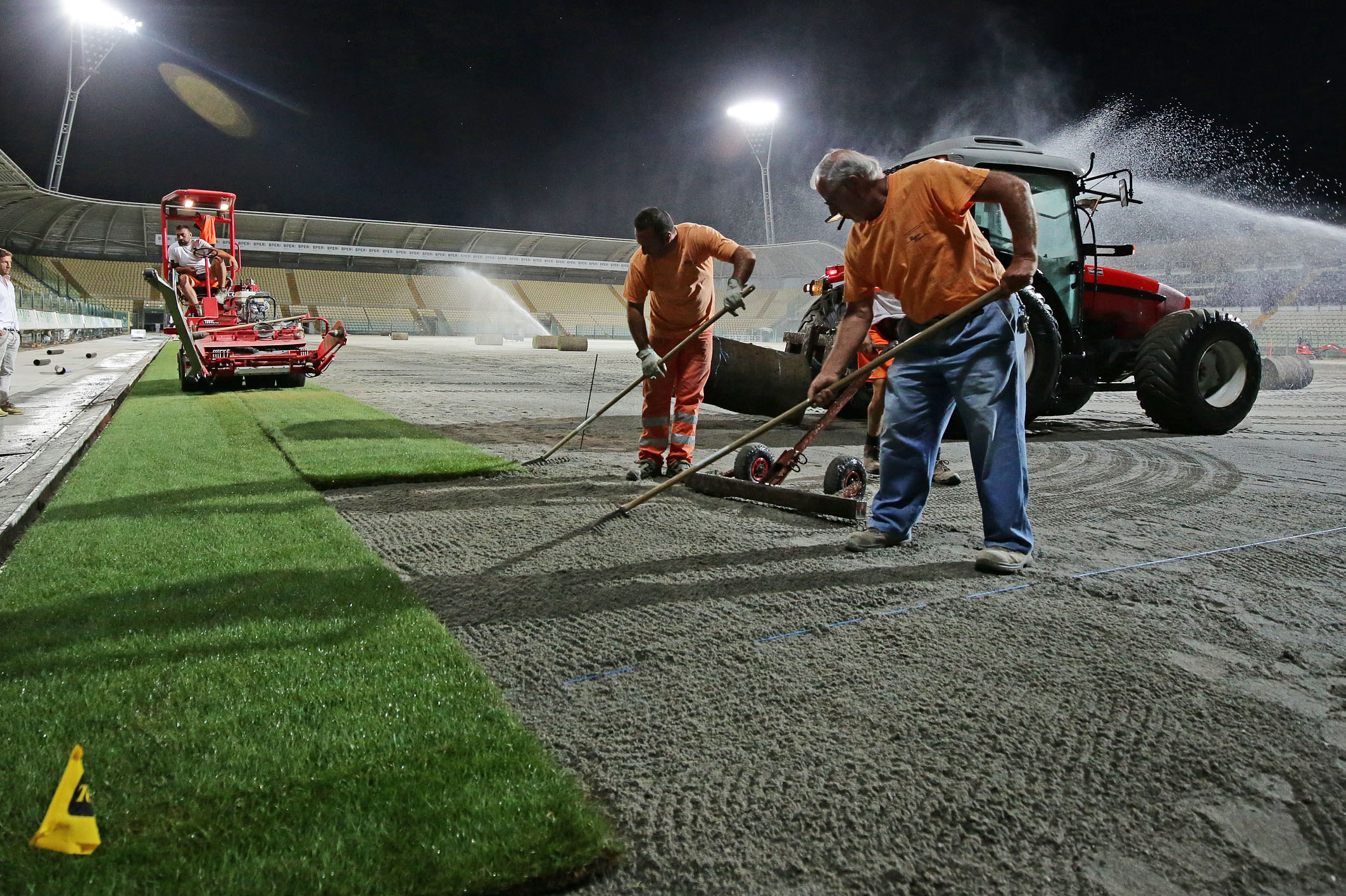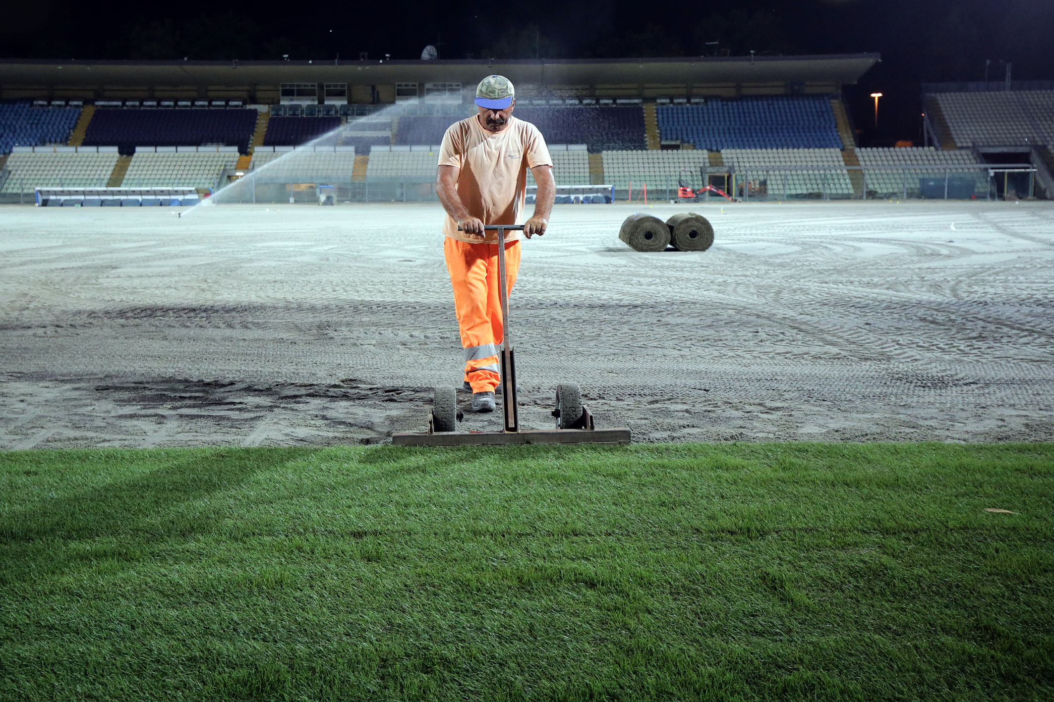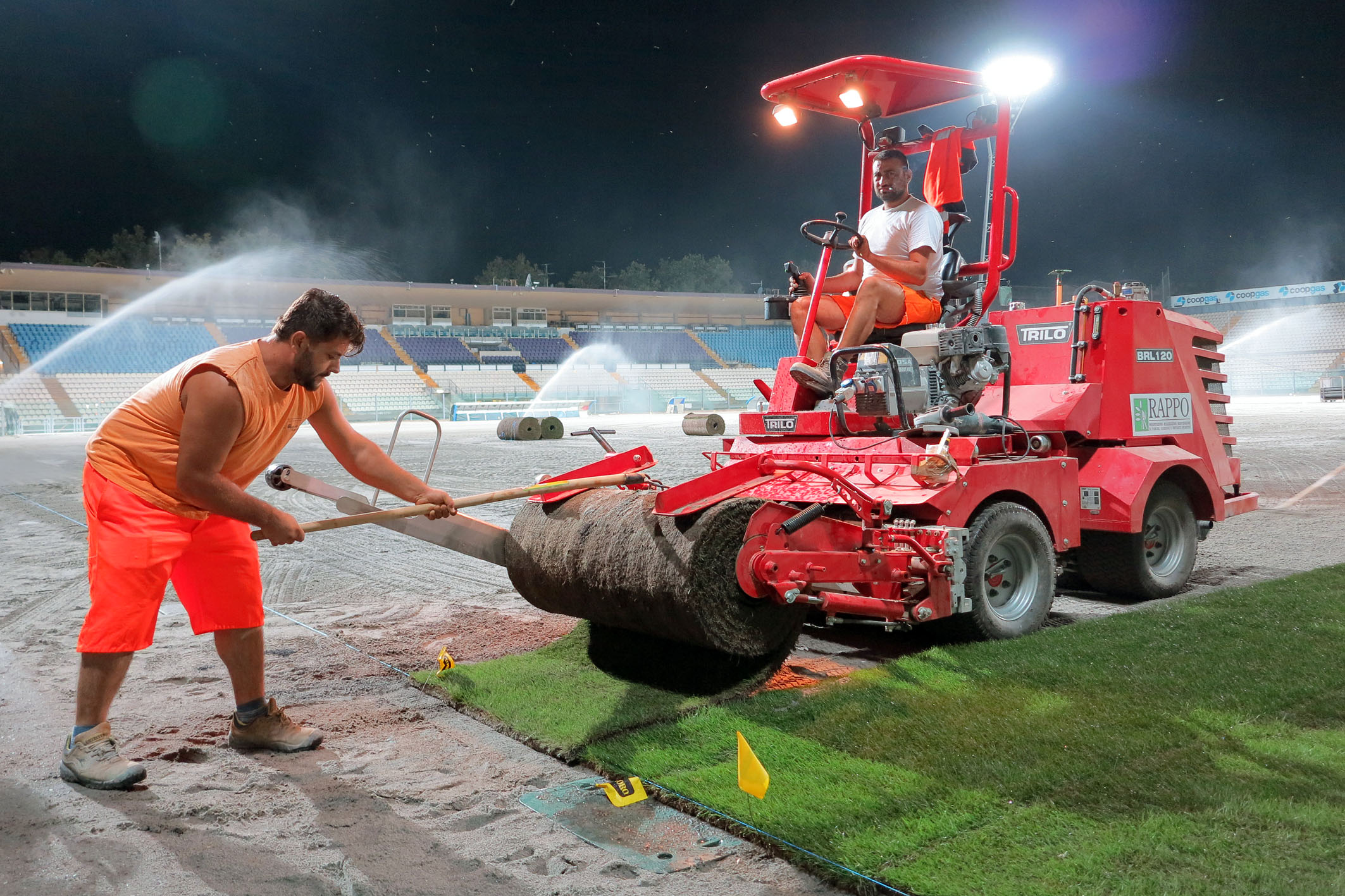 Dopo i lavori di sbancamento e rimozione dell’erba sintetica del precedente campo, il rifacimento del sottofondo, del sistema di drenaggio per la raccolta e lo smaltimento delle acque, dell’impianto di irrigazione e la posa delle serpentine per il riscaldamento anti ghiaccio, in questi giorni gli impianti sono stati coperti con sabbia ed è ora iniziata la posa del manto erboso, rigorosamente di notte per consentirne una miglior conservazione. L’intervento, che nella prima notte ha visto la posa di circa 3.000 metri quadrati di manto erboso, richiederà tre o quattro giorni di attività. Di giorno il manto viene innaffiato e asciugato di continuo per consentirgli di attecchire più facilmente. L’azienda che sta svolgendo i lavori è una delle poche certificate in Italia per l’utilizzo di questo materiale ed è la stessa che ha lavorato al campo dello stadio Bernabeu di Madrid.
