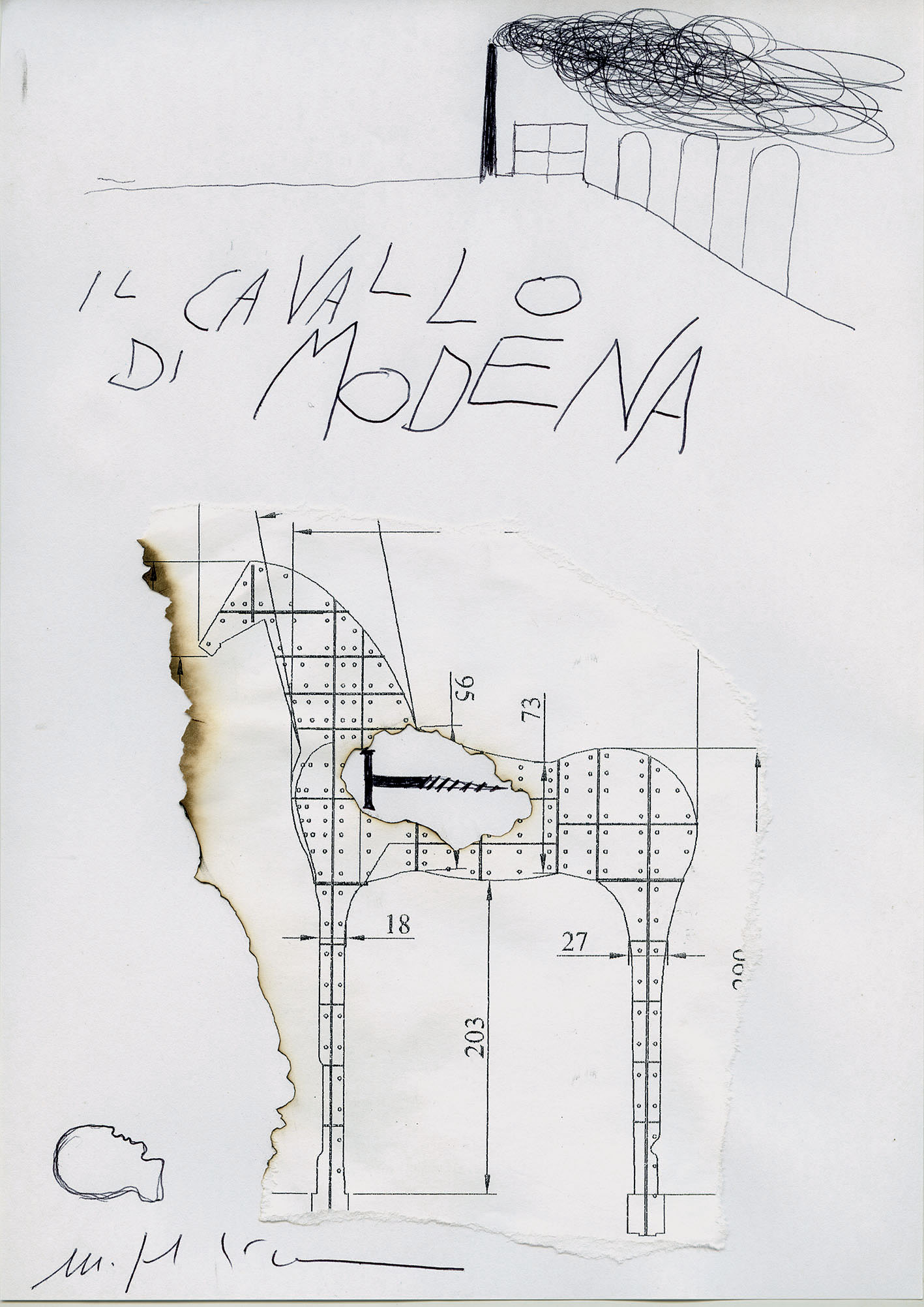 Il “Cavallo di Modena”, spiega nel catalogo della mostra Richard Milazzo, è stato concepito dall'artista per “evocare i famosi quadri per la piazza d'Italia di Giorgio De Chirico e per fare un omaggio a questo grande artista italiano classico. Per me – afferma il curatore - i cavalli di Paladino, e questo in particolare, stoici e inesplicabilmente abbandonati, riempiono un dato spazio o un'area di cui sottolineano il vuoto”.