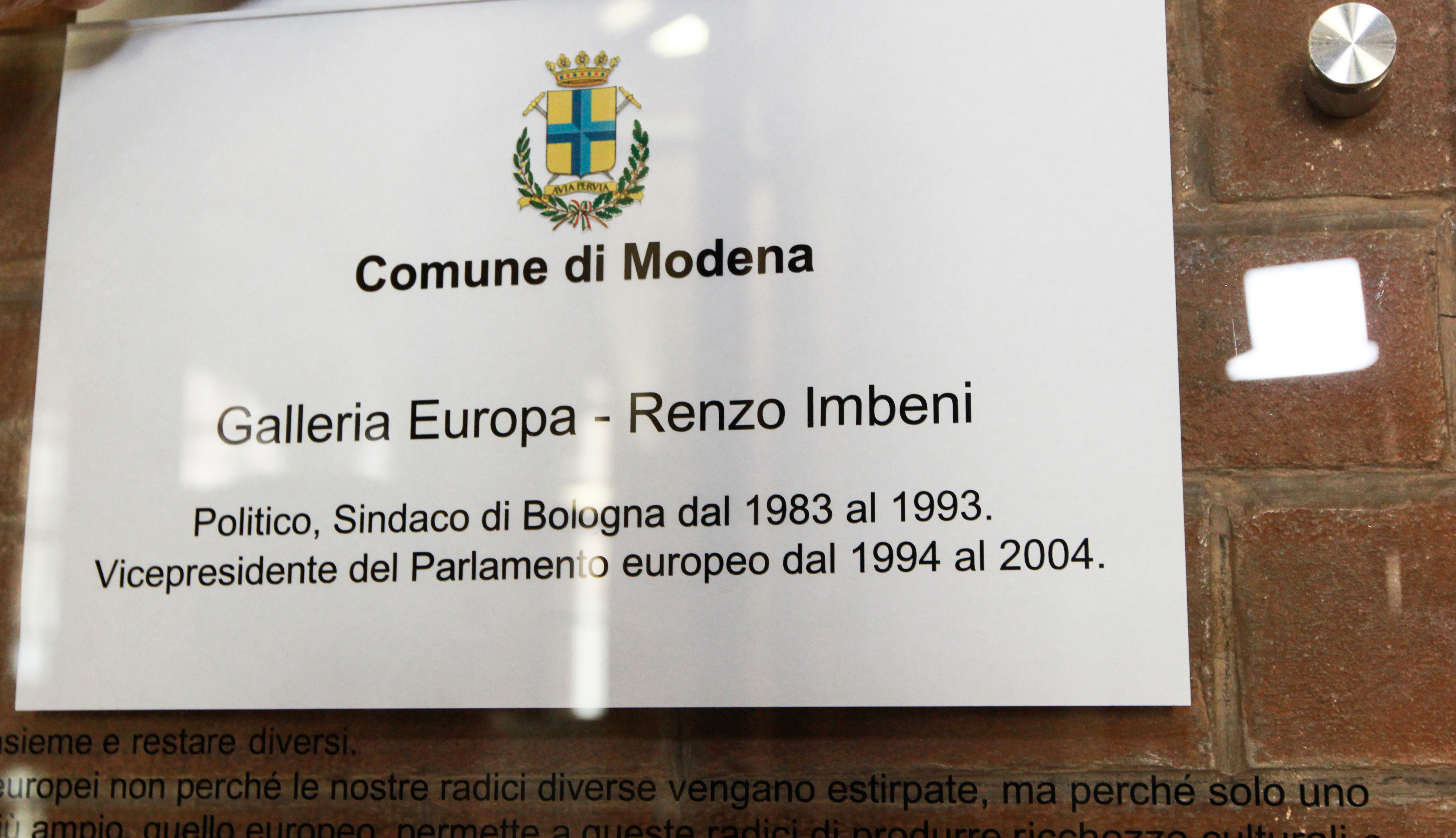 “Stare insieme per restare diversi”. Le parole di Renzo Imbeni (12 ottobre 1944 - 22 febbraio 2005) risuonano in Galleria Europa che oggi, martedì 15 settembre, Modena ha intitolato alla memoria dell’europarlamentare modenese, vicepresidente del Parlamento europeo dal 1994 al 2004, sindaco di Bologna dal 1983 al 1993, animatore dei temi dell'Unione europea sul nostro territorio, in particolare nel mondo della scuola e tra i giovani.