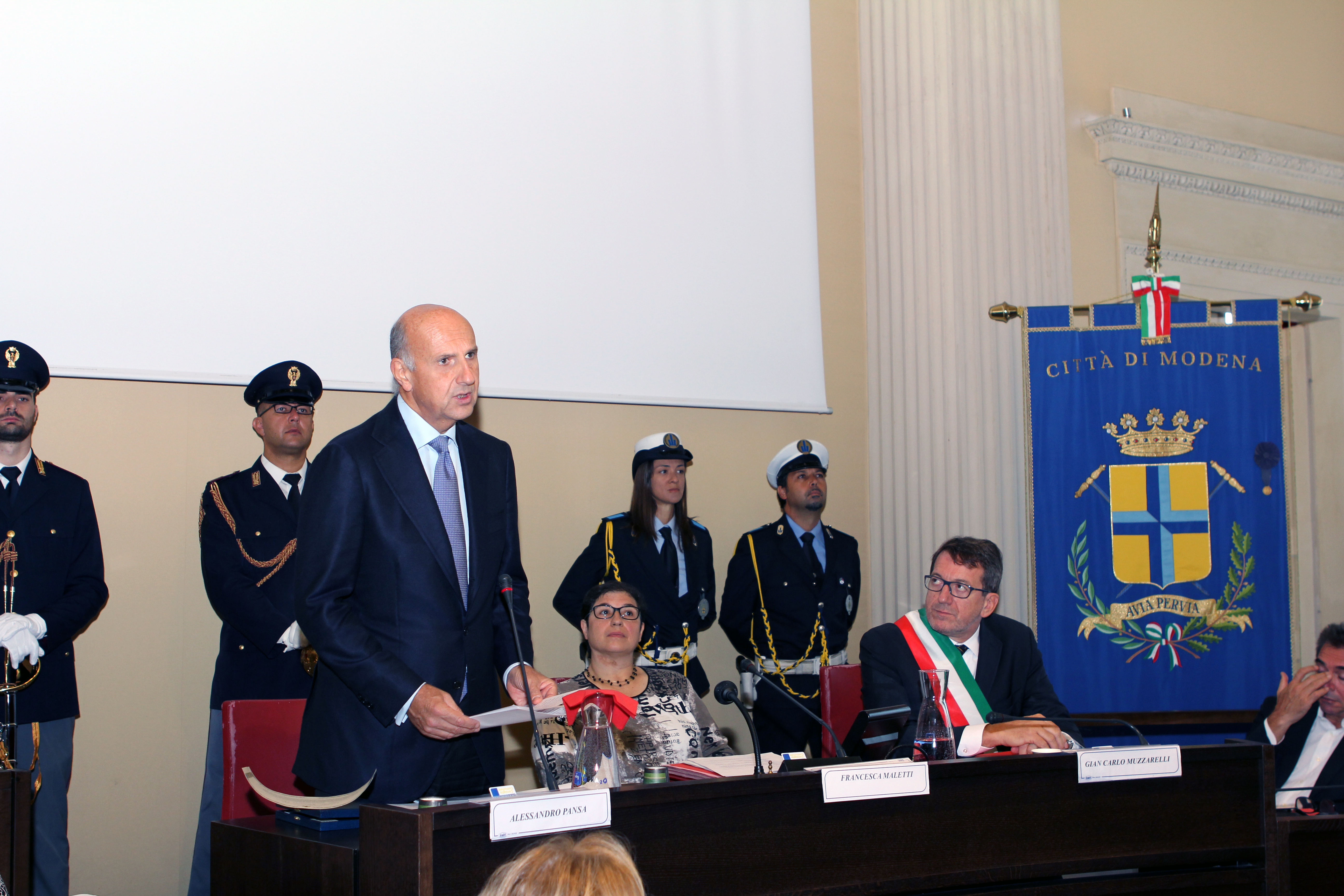 “Una città bella e operosa; una città che attraverso la creatività culturale e artistica, unita all’operosità e all’arte del buon vivere, è un modello di stile italiano nel mondo”. Con queste parole il Capo della Polizia di Stato, Direttore Generale della Pubblica Sicurezza, Prefetto Alessandro Pansa ha salutato Modena di cui da oggi, lunedì 21 settembre, è cittadino onorario, ringraziando per il riconoscimento il presidente e l’intero Consiglio, il sindaco e gli uomini e le donne “che mi hanno dato questa opportunità”, ha detto. Pansa ha quindi sottolineato: “Questa cittadinanza onoraria è un riconoscimento di stima per tutta la Polizia di Stato e soprattutto per coloro che sono intervenuti dopo il terremoto del 2012 e l’esondazione del Secchia. In quelle occasioni i colleghi emiliani si distinsero non solo per le capacità organizzative e d’intervento, ma anche per la capacità di esprimere vicinanza alla popolazione. La loro opera – ha continuato - non si esaurì terminata l’emergenza, per lunghe settimane il nostro personale si prodigò giorno e notte per evitare lo sciacallaggio, tutelare i moduli abitativi e assicurare la sicurezza stradale. E anche nei mesi successivi abbiamo tenuto alta la guardia contro le infiltrazioni mafiose con l’attività di monitoraggio sui cantieri e l’opera svolta dal Girer, il Gruppo interforze dell’Emilia Romagna, tanto che il modello sperimentato qui in Emilia è stato preso a riferimento dal Ministero degli Interni per sviluppare un gruppo interforze. E sono sicuro che il proficuo rapporto di collaborazione sviluppato dalla Polizia di Stato con enti locali e cittadini modenesi continuerà”.