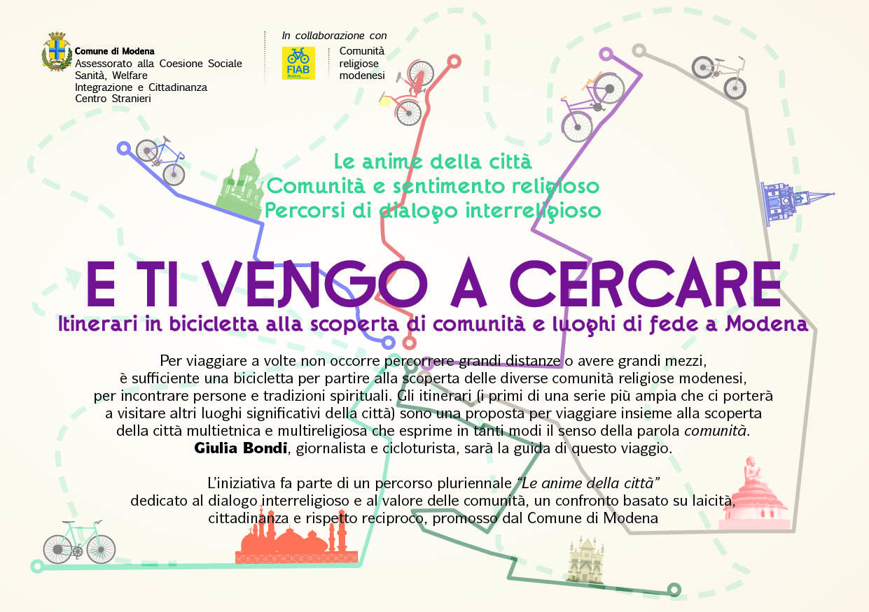Dalla Sinagoga alla Chiesa ortodossa, dalla Moschea al Centro islamico, facendo tappa in tanti altri luoghi di fede che sicuramente non tutti modenesi conoscono. Pochi chilometri in bicicletta bastano per compiere un viaggio alla scoperta delle diverse comunità religiose presenti a Modena, incontrare nuove persone e diverse tradizioni spirituali. È questo l’obiettivo dell’iniziativa “E ti vengo a cercare. Itinerari in bicicletta alla scoperta di comunità e luoghi di fede a Modena” promossa dall’assessorato a Welfare, Integrazione e Cittadinanza del Comune di Modena e organizzato dal Centro Stranieri in collaborazione con Fiab Modena e le principali comunità religiose presenti in città. E già possibile iscriversi ai primi due tour guidati in programma sabato 26 e domenica 27 settembre.