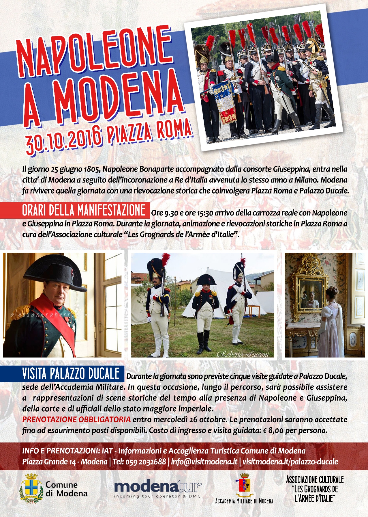 L’appuntamento, a cura dell’associazione culturale “Les Grognards de l’Armèe d’Italie” in collaborazione con Comune di Modena e Modenatur e grazie alla disponibilità dell’Accademia Militare si svolge tra piazza Roma e il Palazzo Ducale, visitabile su prenotazione (gli ultimi posti, costo di ingresso e visita guidata: 8 euro a persona, sono prenotabili entro le 12 del 27 ottobre allo Iat, Ufficio informazioni e accoglienza turistica del Comune di Modena, piazza Grande 14, tel. 059 2032660, info@visitmodena.it - visitmodena.it/palazzo-ducale).