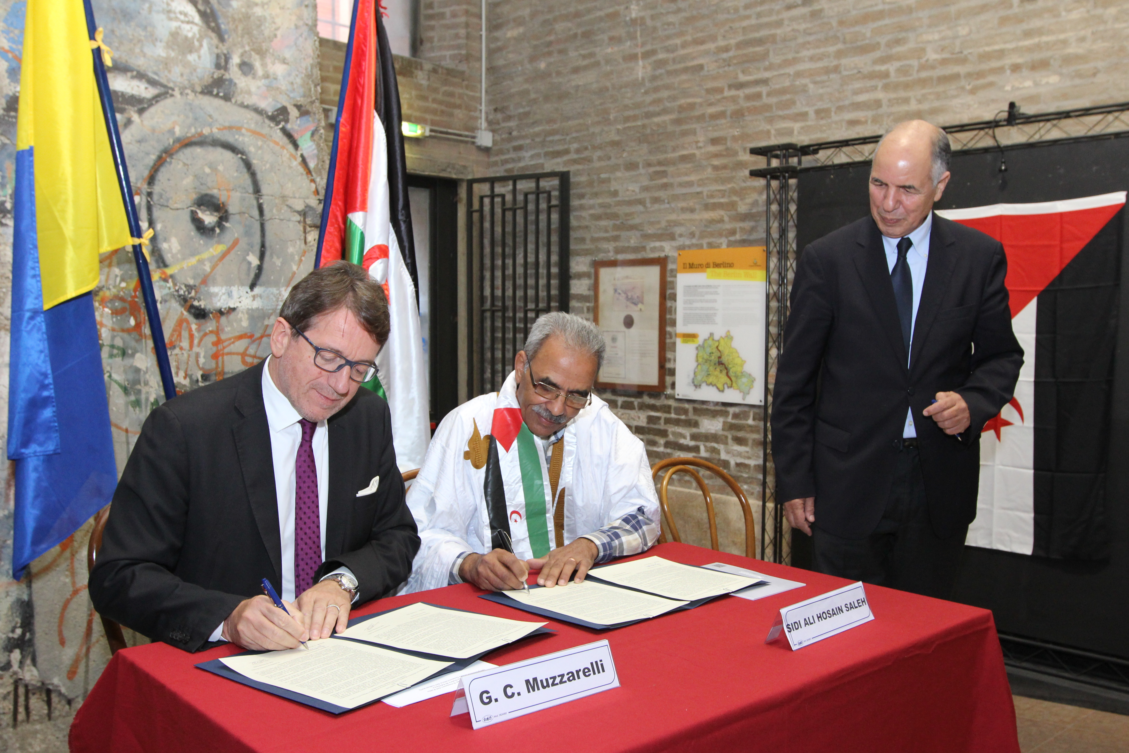 La firma è avvenuta nella Galleria Europa al piano terra del Municipio, dove è allestita la mostra fotografica di Livia Tassinari “Tana libera tutti”, realizzata con la collaborazione della Regione, che racconta la difficile vita nei campi profughi e nei territori occupati del Sahara occidentale.