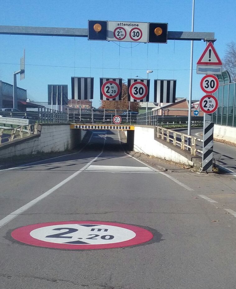 I lavori hanno previsto l’installazione in entrambi i sensi di marcia di bandinelle limite altezza 2.20 metri, collocati sotto il portale: la loro funzione è di avvisare acusticamente del pericolo il conducente di un mezzo che abbia un’altezza superiore. Sul manto stradale è stata posata una coppia di segnali di divieto di transito ai veicoli superiore ai 2,2 in materiale termoplastico per ogni senso di marcia, alle facciate del sottopasso è stata infine data una colorazione in rosso e bianco.