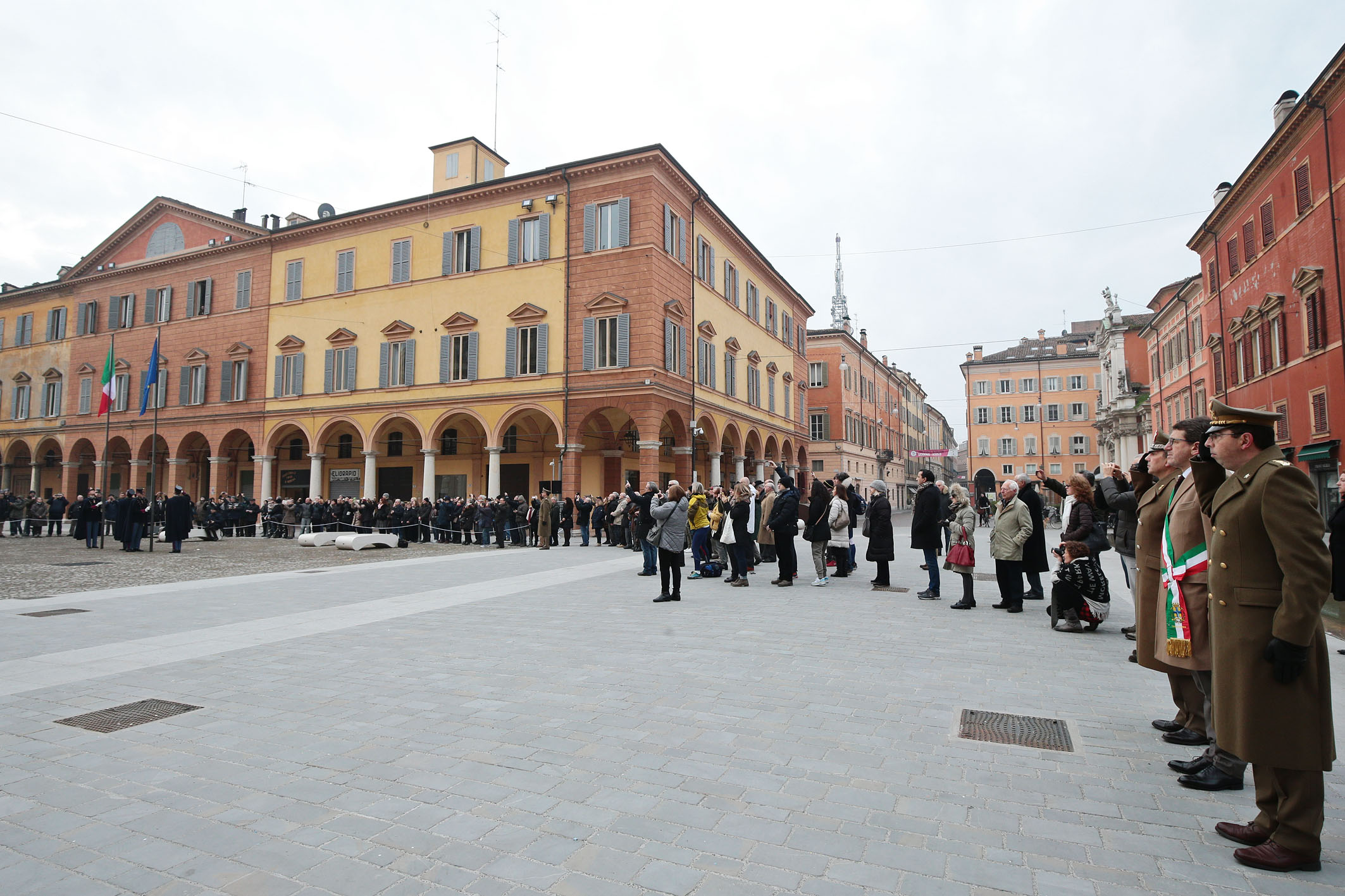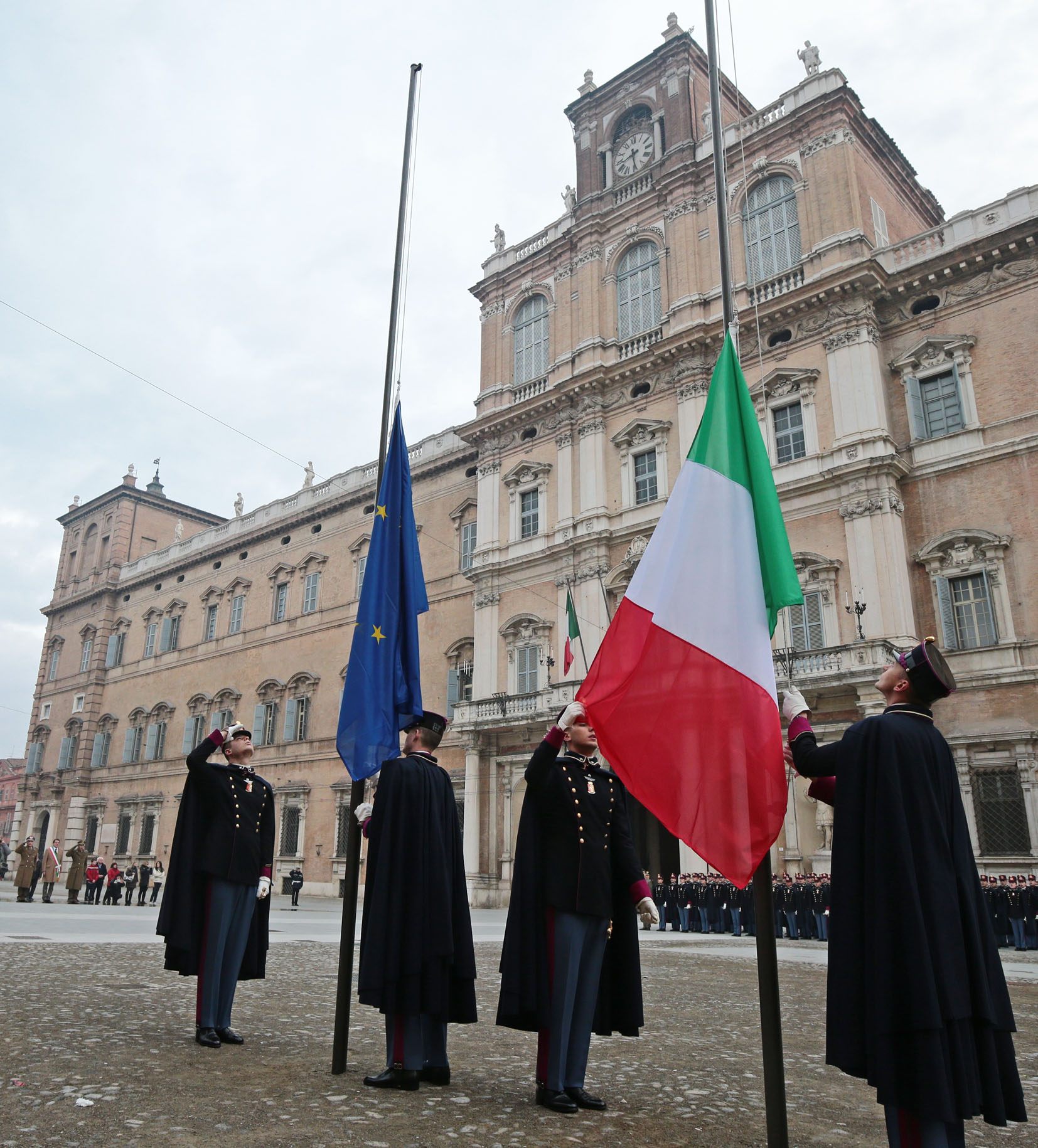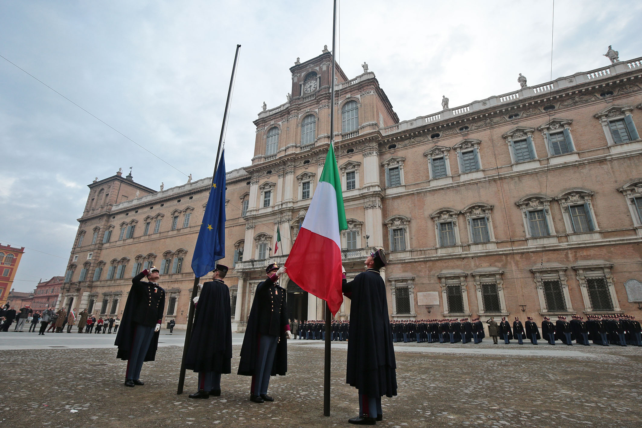 L'iniziativa è frutto di un accordo tra Comune e Accademia militare che dallo scorso febbraio hanno stabilito un appuntamento periodico con l’alzabandiera per la prima domenica del mese fino a giugno, per poi riprendere da ottobre. Obiettivo dell’accordo è contribuire a valorizzare piazza Roma con “un’iniziativa dall’alto valore simbolico – come aveva spiegato il sindaco Muzzarelli - che sottolinea l’ottimo rapporto della città con l’Accademia e la stretta collaborazione nella promozione del Palazzo Ducale”. Temi ripresi anche dal generale Camporeale definendo Piazza Roma “luogo di ideale unione fra l’istituto di formazione militare più antico d’Europa e la città”.